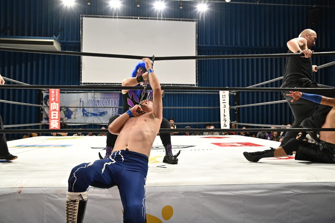 ディアブロ組は加藤に合体攻撃から、瓦井が急所蹴り。ディアブロはラリアットで加藤を場外に吹っ飛ばすと、リングに戻して、掟破りの足4の字固めもカット。ディアブロは加藤にチェーン絞首刑も、加藤が耐えて脱出。
