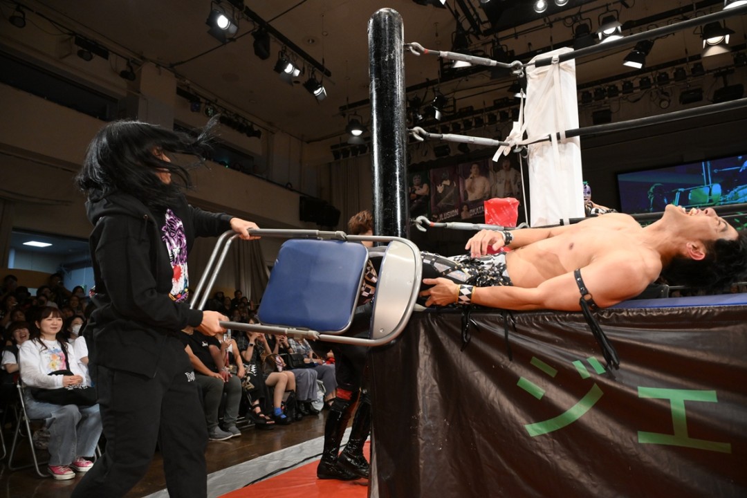 しかし逆に岡谷も観客席に投げて、竹刀で連打。さらに鉄柱に武知の足を固定すると、セコンドの佐々木がイス攻撃。