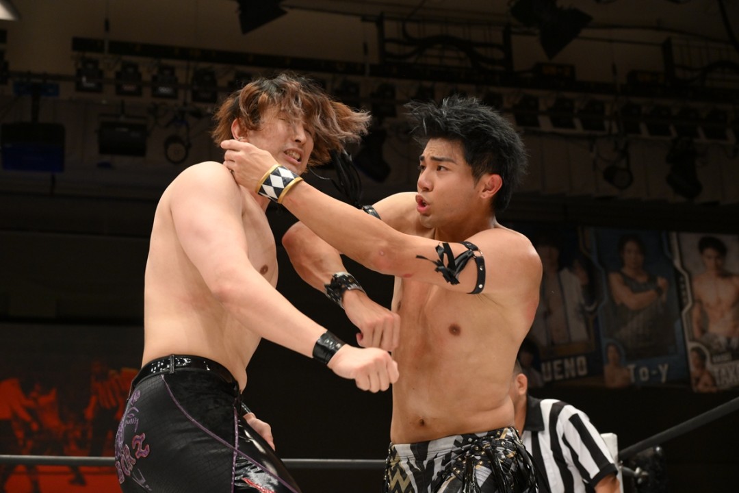 武知が岡谷にエルボーを連打すれば、岡谷は噛みつき。武知が飛びつき式フランケンシュタイナー、ランニング・エルボーを叩き込むと、岡谷とエルボーのラリー。