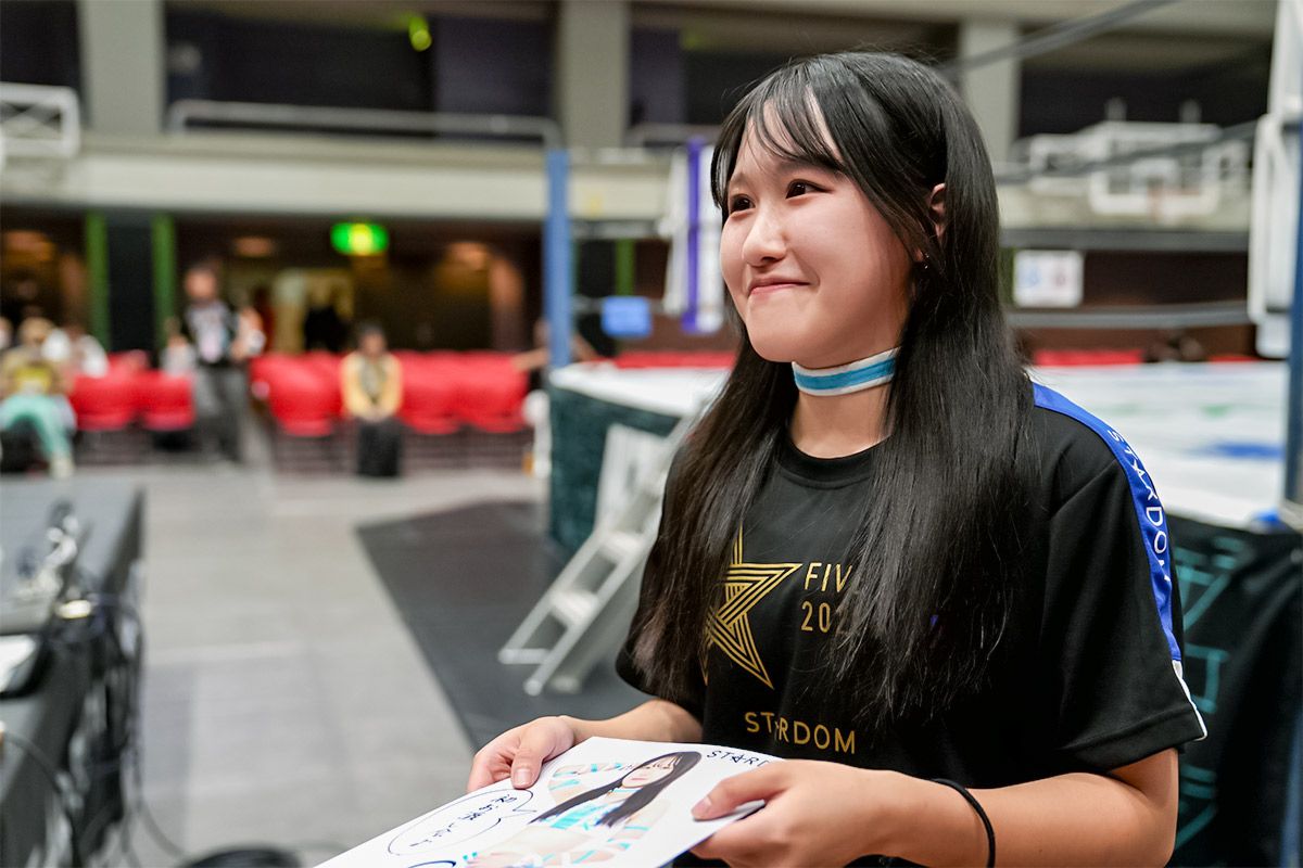 「小学5年生のときにテレビでDRAGON GATEを見たのが最初でした。お父さんが誘ってくれたんですよ。なぜだかはよくわからないです(笑)。私は三姉妹の2番目なんですけど、私が一番興味ありそうに見えたんじゃないですかね。最初はルールもなにもわからないので、荒々しいなとか痛そうだなという感想しかなかったです。でもそこからハマっていって、YAMATO選手、Eita選手、ドラゴン・キッド選手がとくに印象に残りました。そのうちほかの団体も見るようになって、会場にも行くようになりましたね。最初の女子プロがスターダムの大阪城ホール(2021年10・9)。葉月さんの復帰戦がすごく印象的でした」