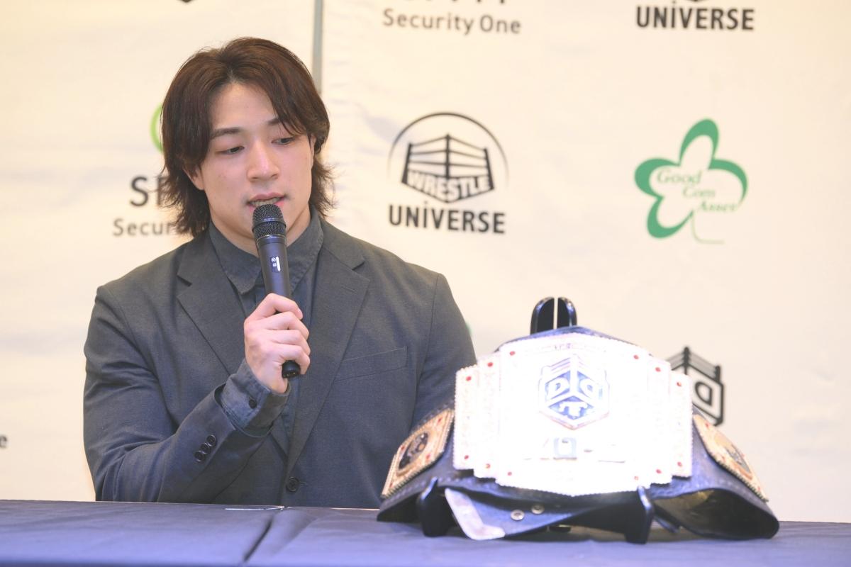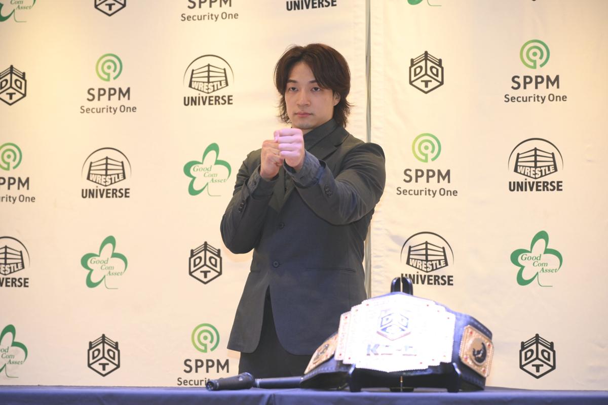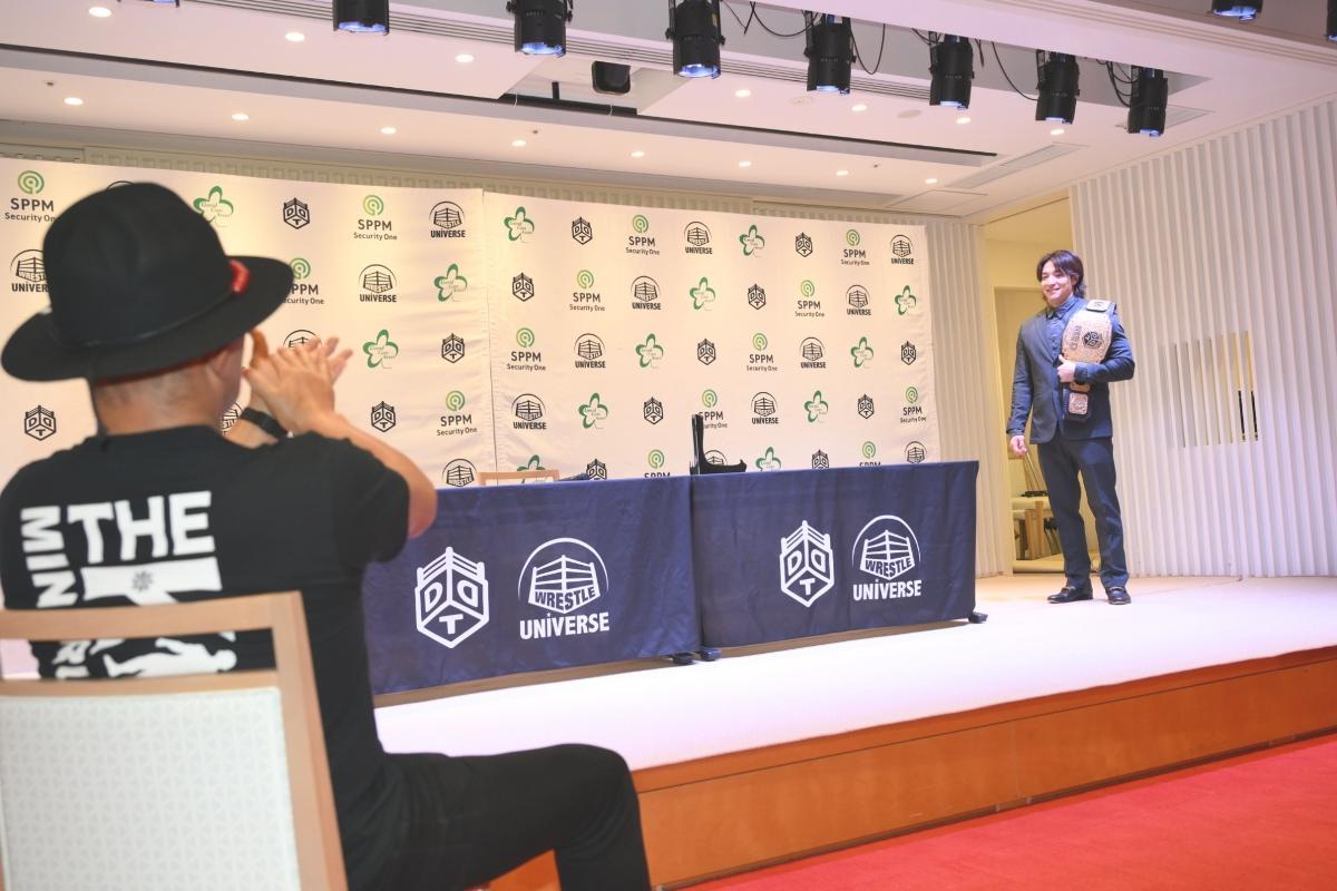 鈴木とのダブルタイトルマッチが決まったことについて、「鈴木さんが持ってるUNIVERSALに、どうやったら挑戦できるんだろうって、この半年ずっと考えていて。僕が呼び出して、タイトルマッチをして負けたから、次に僕が挑戦者に名乗り出るにはどうしたらいいかって思っていて。DDTの一番のベルトを獲って、そのベルト懸ければ挑戦させてくれるんじゃないかと思っていて。須見に勝った後、鈴木さんがこのベルトが欲しいと出て来てくれたとき、ドキドキしました。自分の思ってることを素直に言おうと、鈴木みのるが持ってるUNIVERSALが欲しいと言いました。この半年間、鈴木さんと組んだり、DDTの仲間たちがボコボコにされてる姿を見たりしてきましたけど、なぜか嫌いになることができず。鈴木さんに1度負けた僕が、このダブルタイトルマッチで負けるようなことがあれば、もう今後二度と鈴木さんに挑戦しないと決めてます。でも僕が勝ちますんで、大丈夫です」と語った。