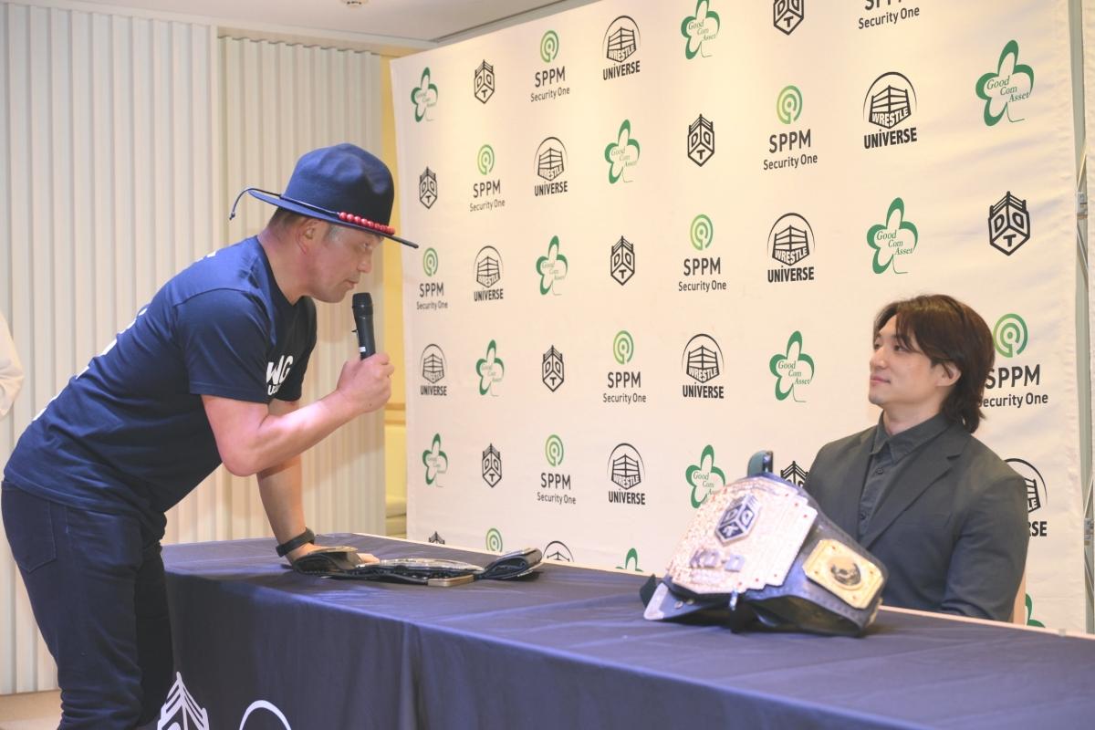 【DDT】『週刊パイルドライバー』記者を自称する鈴木みのるの質問攻めに上野勇希はたじたじも、「僕が2冠のチャンピオンになる」と自信