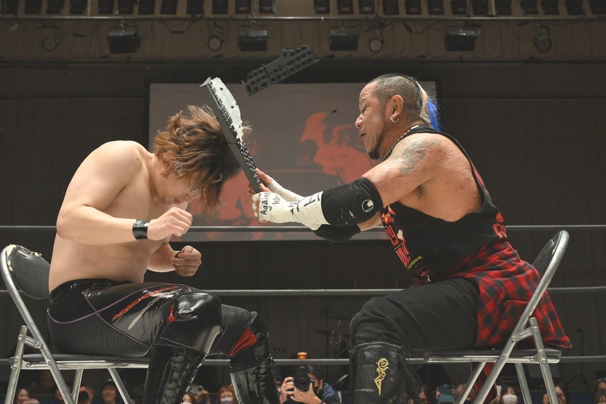 悪の軍団に入る前、岡谷は勝俣瞬馬との戦いでハードコアに目覚めた。6・18新宿での「CHARISMANIA Ⅱ」では、その道のエキスパートの木髙イサミとのハードコア戦で敗退。今大会では葛西と対戦するチャンスが訪れた。