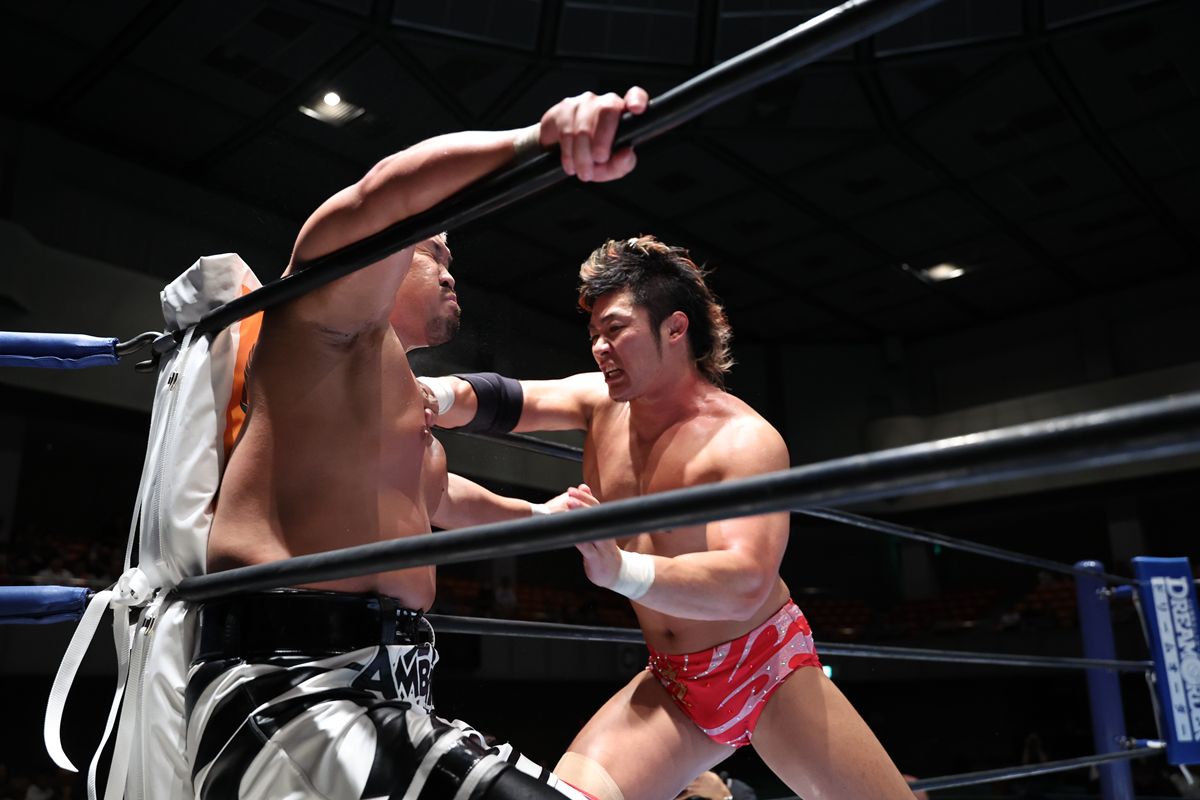 試合は、王者組が本間を捕まえ、そのパワーで蹂躙する展開となったが、リング内外で常に火花を散らしていたのは上村とIceであった。試合後もその乱闘は収まらず、セコンドが必死に引き離すほどの激しい憎悪をぶつけ合った。