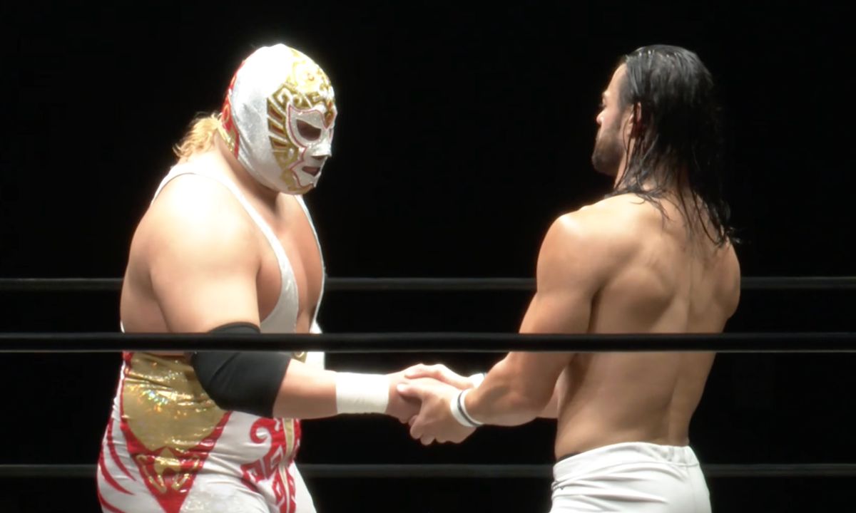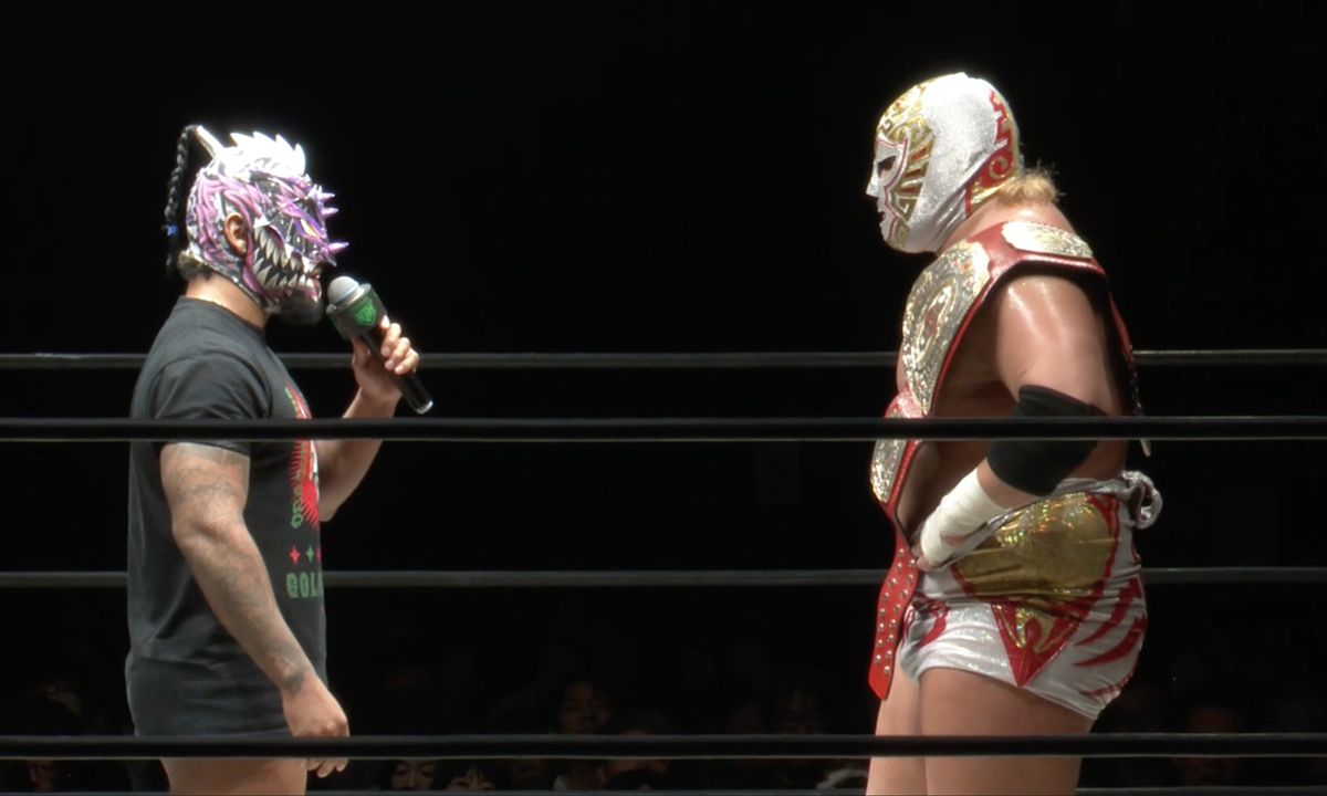 ベイン「ガレノ、会場のみんなも僕もあなたのことをリスペクトしてる。だけど、僕はあなたを超えてると思うんだ。それを証明するためにも、あなたの持つGHCナショナル、次の挑戦者はドラゴン・ベインでいいかな? 僕たちメキシカンで歴史を作ろう」
