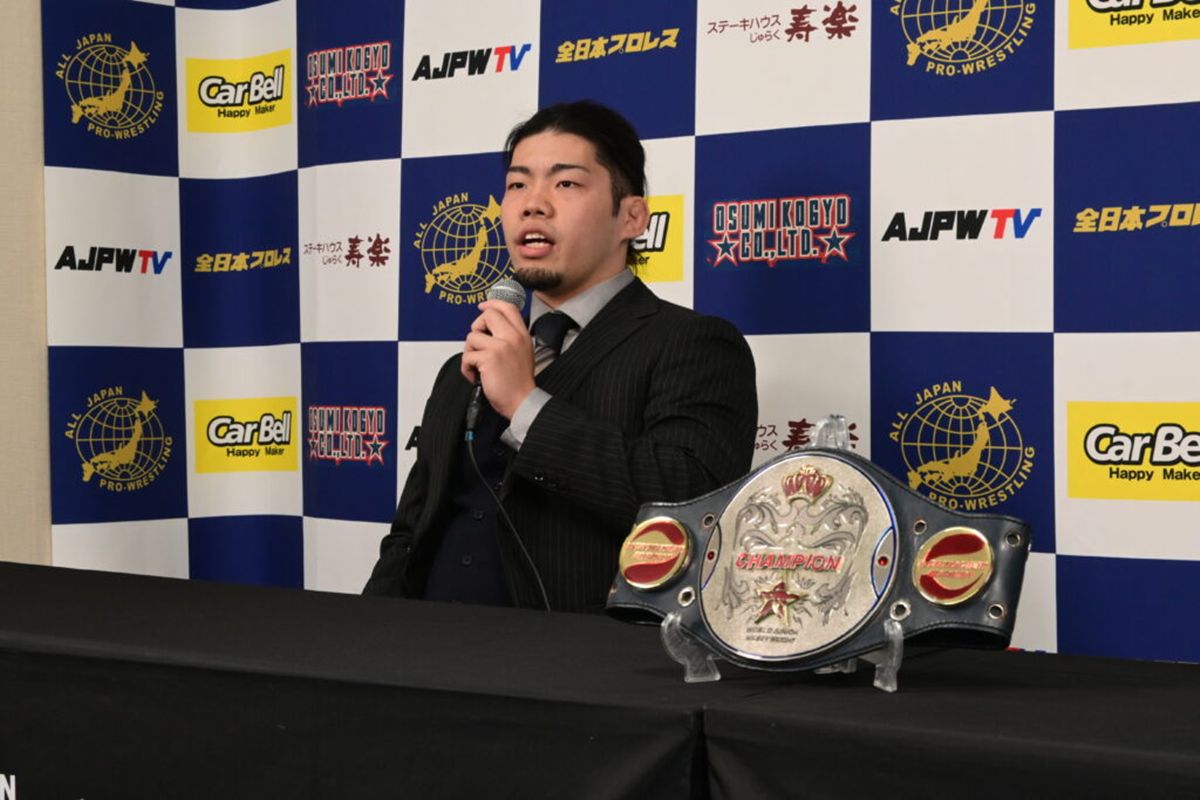 さらに、「お客さんが井上凌を支持しているっていうのを肌で感じた」と挑戦者の勢いを認めながらも、「それでも世界ジュニアはまだ遠いんだということを教えて、青柳亮生のためにもなる防衛戦にしたい」と、“公開授業”で格の違いを見せつけると予告。「タイトルマッチはこういうもんだ、全日本プロレスってのはこういうもんだっていうのをリング上でじっくり教えられる」と、最後まで“上から目線”を貫いた。