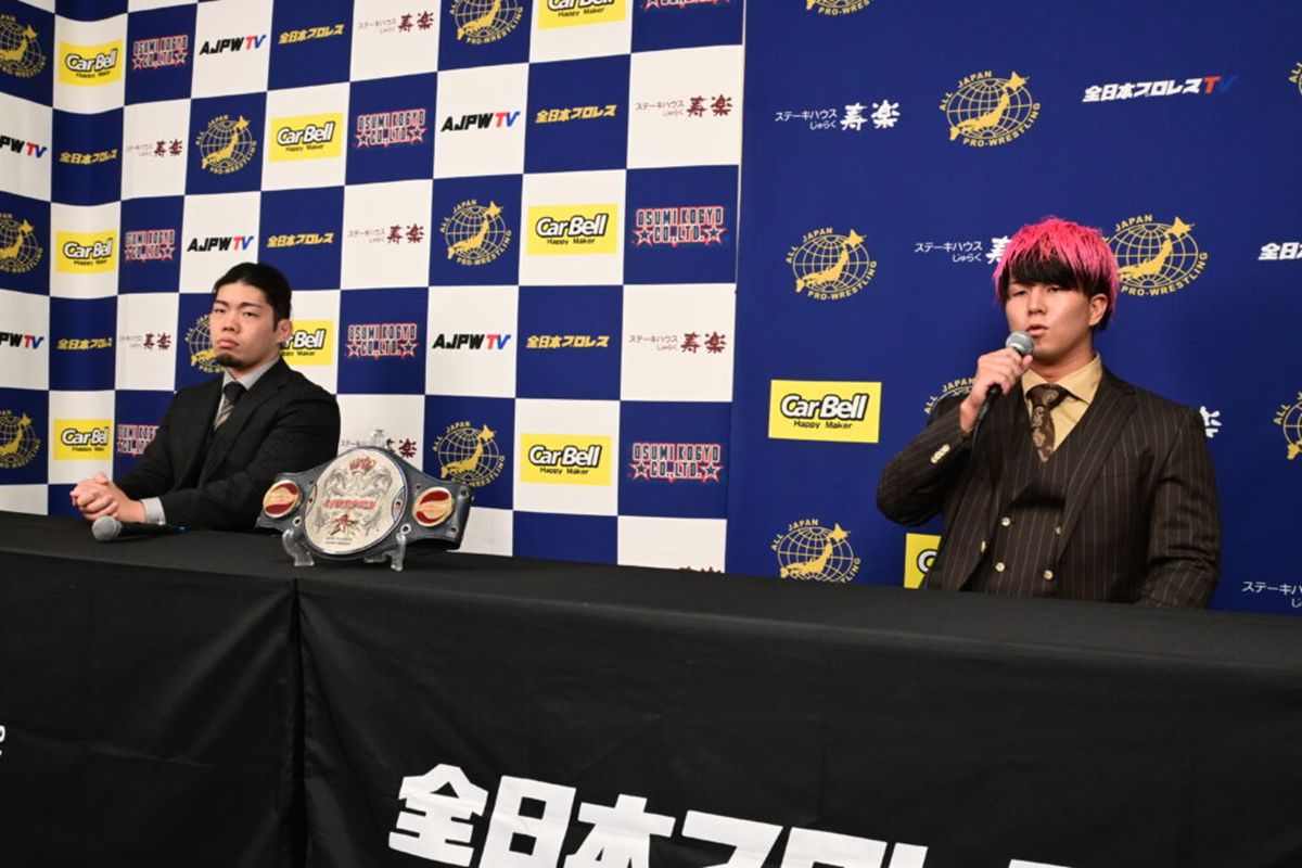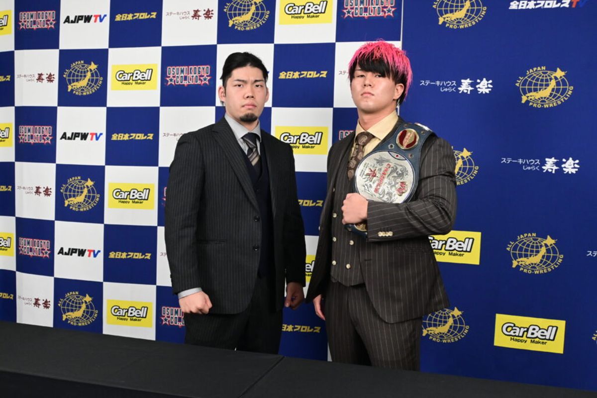 全日本プロレスは都内事務所で記者会見を開き、「旗揚げ記念シリーズ2025」(10月11日、埼玉・行田グリーンアリーナ)で行われる世界ジュニアヘビー級選手権試合に向け、王者・青柳亮生と挑戦者・井上凌が火花を散らした。