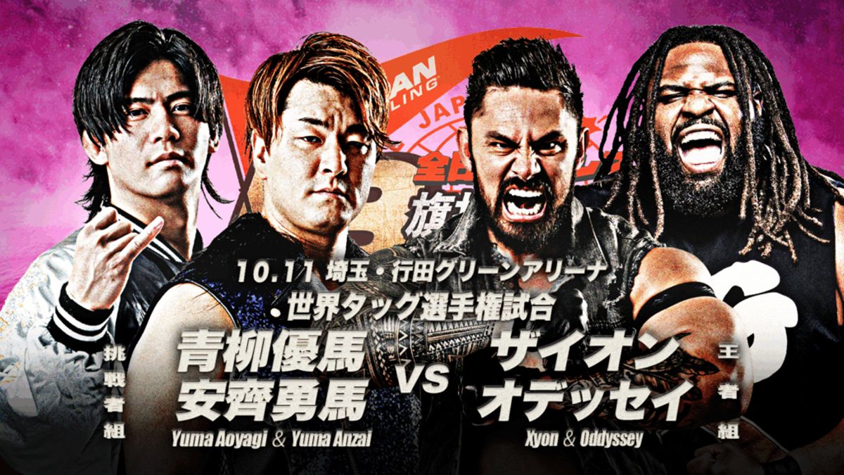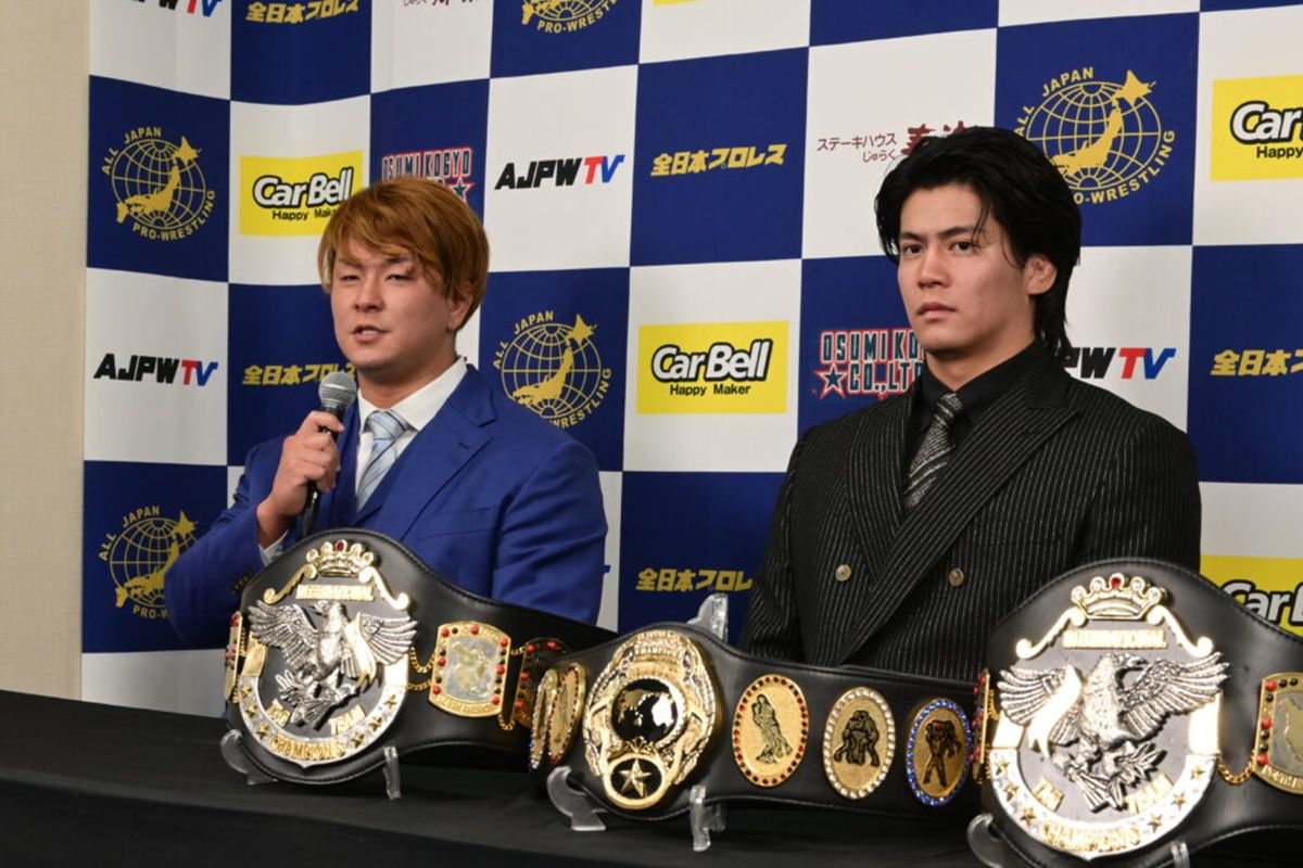 全日本プロレスは都内事務所で記者会見を開き、「旗揚げ記念シリーズ2025」(10月11日、埼玉・行田グリーンアリーナ)のメインイベントで行われる世界タッグ選手権試合に向け、王者組のザイオン&オデッセイと、挑戦者組の青柳優馬&安齊勇馬が火花を散らした。