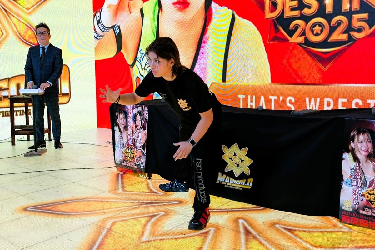 女子プロレス団体「マリーゴールド」は9日、都内で記者会見を開き、10月26日の東京・両国国技館大会で、山岡聖怜が“女子プロレス界最強”の呼び声も高い、センダイガールズプロレスリングの橋本千紘とシングルマッチで対戦することを発表した。