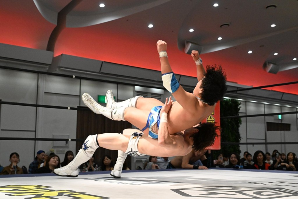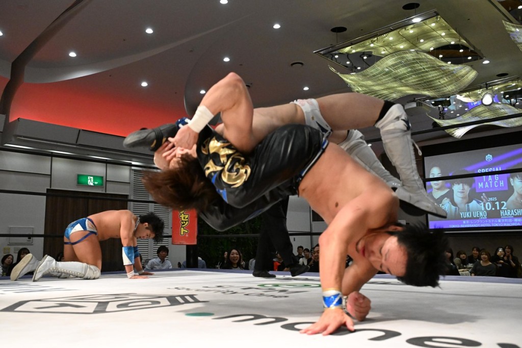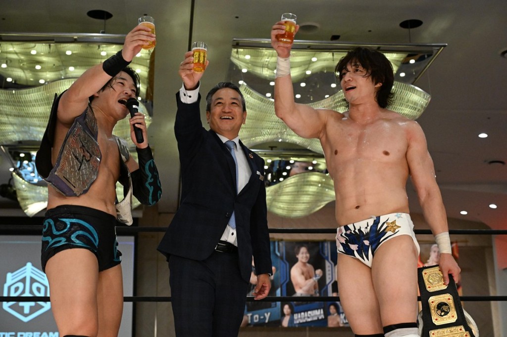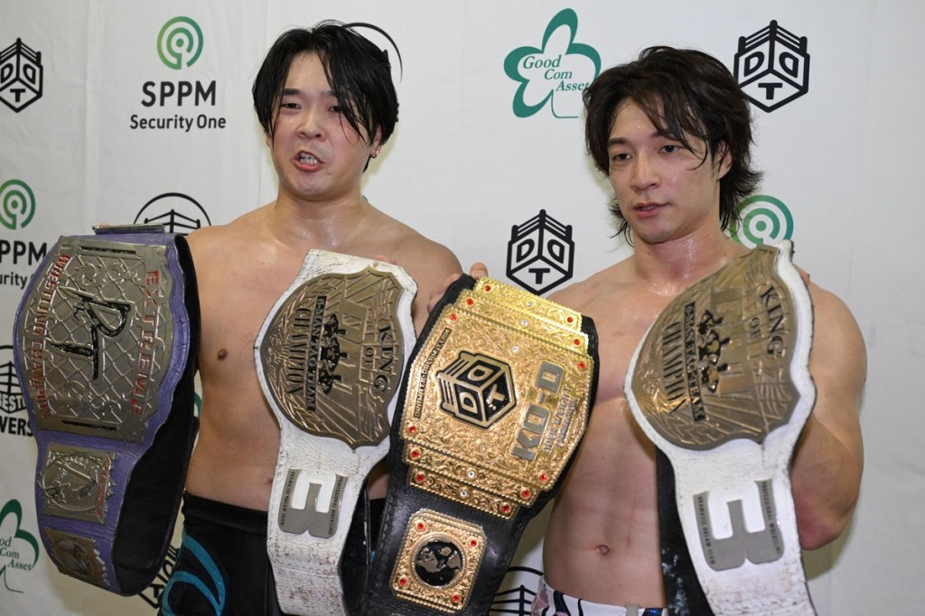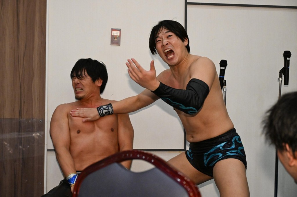 バックステージで上野は「チャンピオンで居続けるために、僕たちがいるわけじゃない。僕たちが成長しようと思ったら、我々ベルトを2本持つという状態です。チャレンジャー、きばってこんと置いていっちゃうよ。鈴木さんもHARASHIMAさんもチャンピオンの血が濃く流れてるんで、高鹿さん、頑張らないと俺たちが進んでいくための物語になっちゃうよ」、To-yは「高鹿さん、鈴木さんの怖くて魅力的な存在に隠れてばっかじゃ、俺たちには勝てないぞ。僕らシングルでもタッグでも結果残してる。そこに武知さんというスーパースターが加わることで最強なんだ。10・19後楽園、防衛してやる!」と初Vに自信を深めていた。