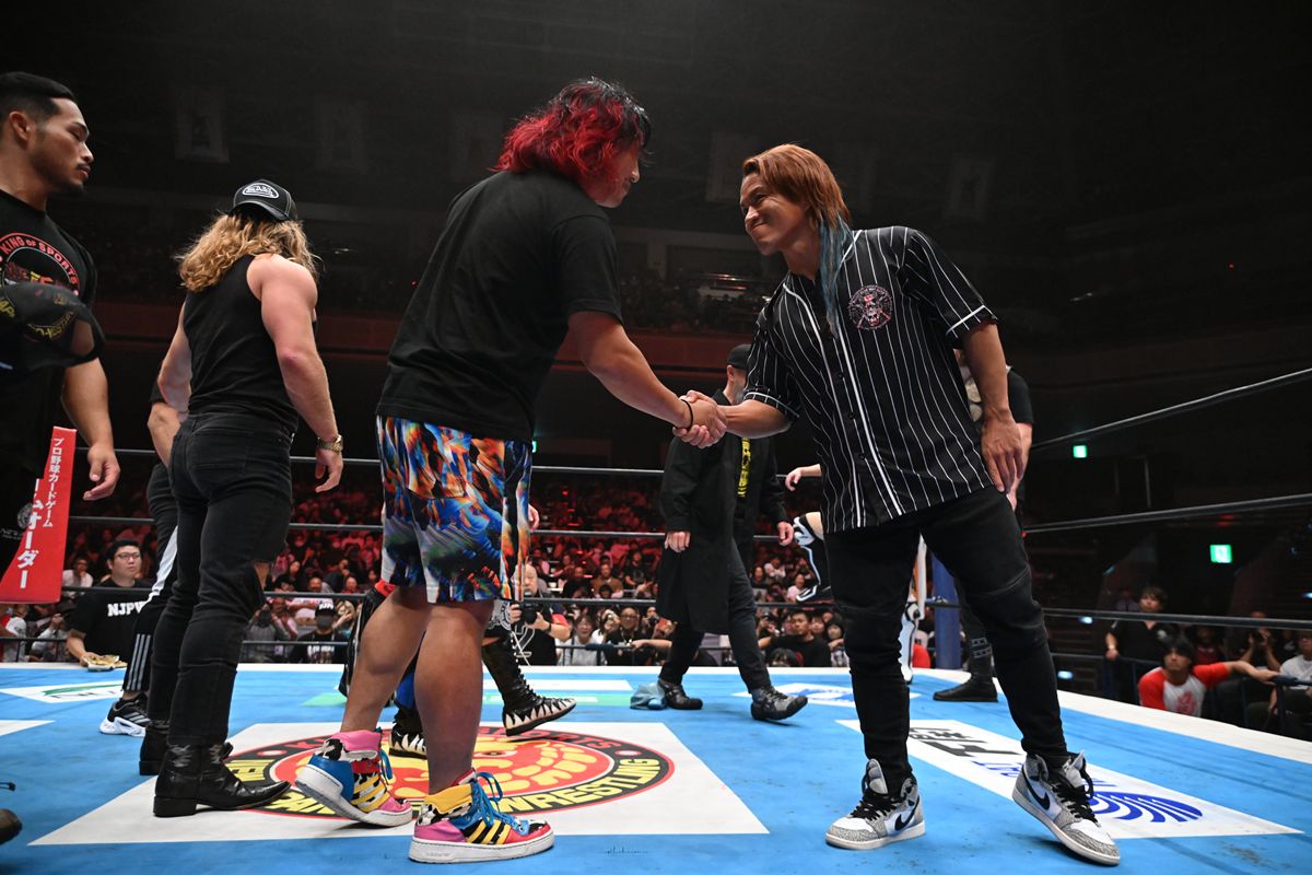 しかし、この日の本当の衝撃は、試合後に訪れた。これまで激しい抗争を繰り広げてきた辻率いる“無所属”ユニットと、デビッド・フィンレー率いる“BULLET CLUB WAR DOGS”が、リング上で電撃的に握手を交わし、和解を果たしたのである。