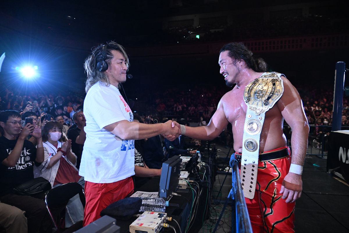 「フィンレー、ゲイブ、そしてWAR DOGSのメンバー、この1カ月間、ありがとうな。お前らのおかげで俺はさらにレベルアップすることができた。感謝してるよ。あの握手はそういう意味だ。これでアンタらとの闘いも一区切りだ。お互い削り合うのはもうやめにしよう。棚橋社長、今さらだがアンタがいなければ俺はこの世界にいなかった。これが俺がアンタにできる俺なりの恩返しの形だ。やろうぜ、IWGP」