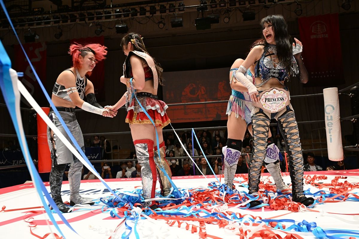 上福にとって、まなせはデビュー戦でのパートナーであり、初のタッグ王座挑戦の際にもコンビを組んだ元タッグパートナー。上原と凍雅は同じ日に練習を始めた同期生で、4選手ともにさまざまな思いを抱いてのタイトル戦となった。