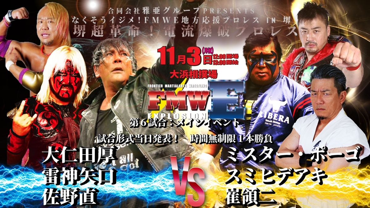 “邪道”大仁田厚率いるFMWEは21日、11月3日(月・祝)に大阪・堺市の大浜相撲場で開催する「第3回・なくそうイジメ!FMWE地方応援プロレス in 堺・堺超革命!電流爆破プロレス」の全対戦カードを発表した。