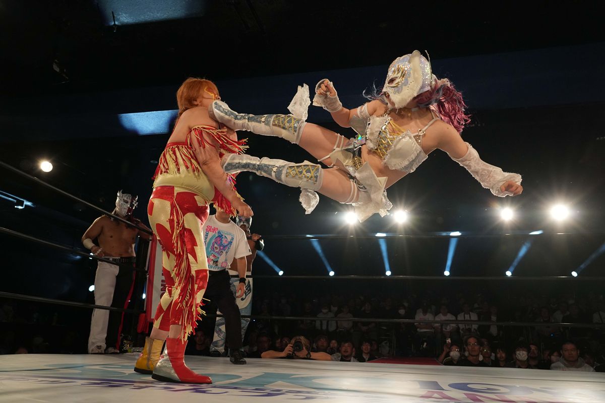 デスペラードのバックドロップから、最後はキッドが「終わりだ!」と叫び、ムーンサルトプレスを投下。しかし、これは京子がカウント2でキックアウト。