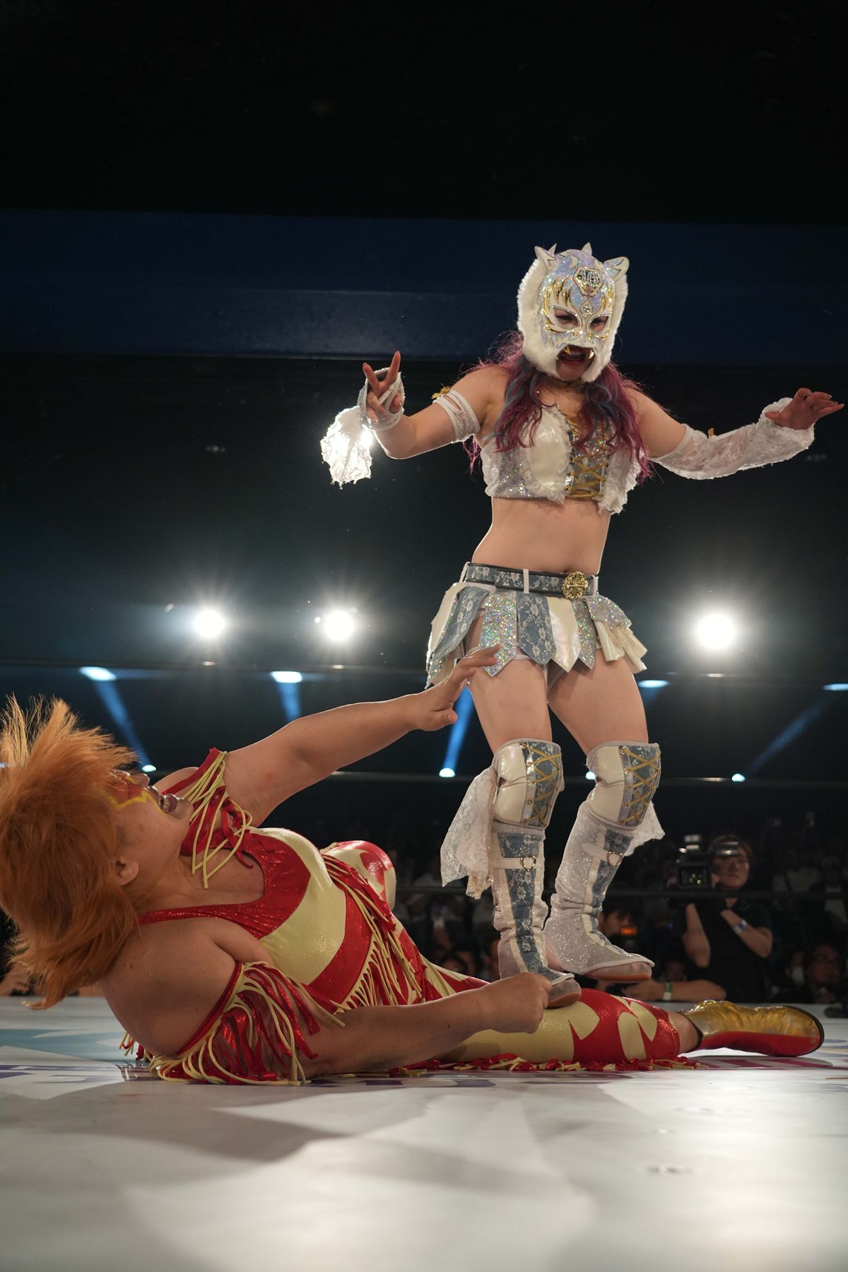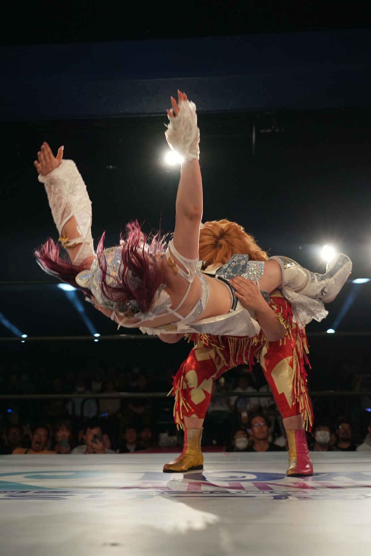 さらに、鷹木のデスバレーボム、葛西のパールハーバースプラッシュ、そしてとどめは、憧れの井上京子によるハイアングルパワーボム。