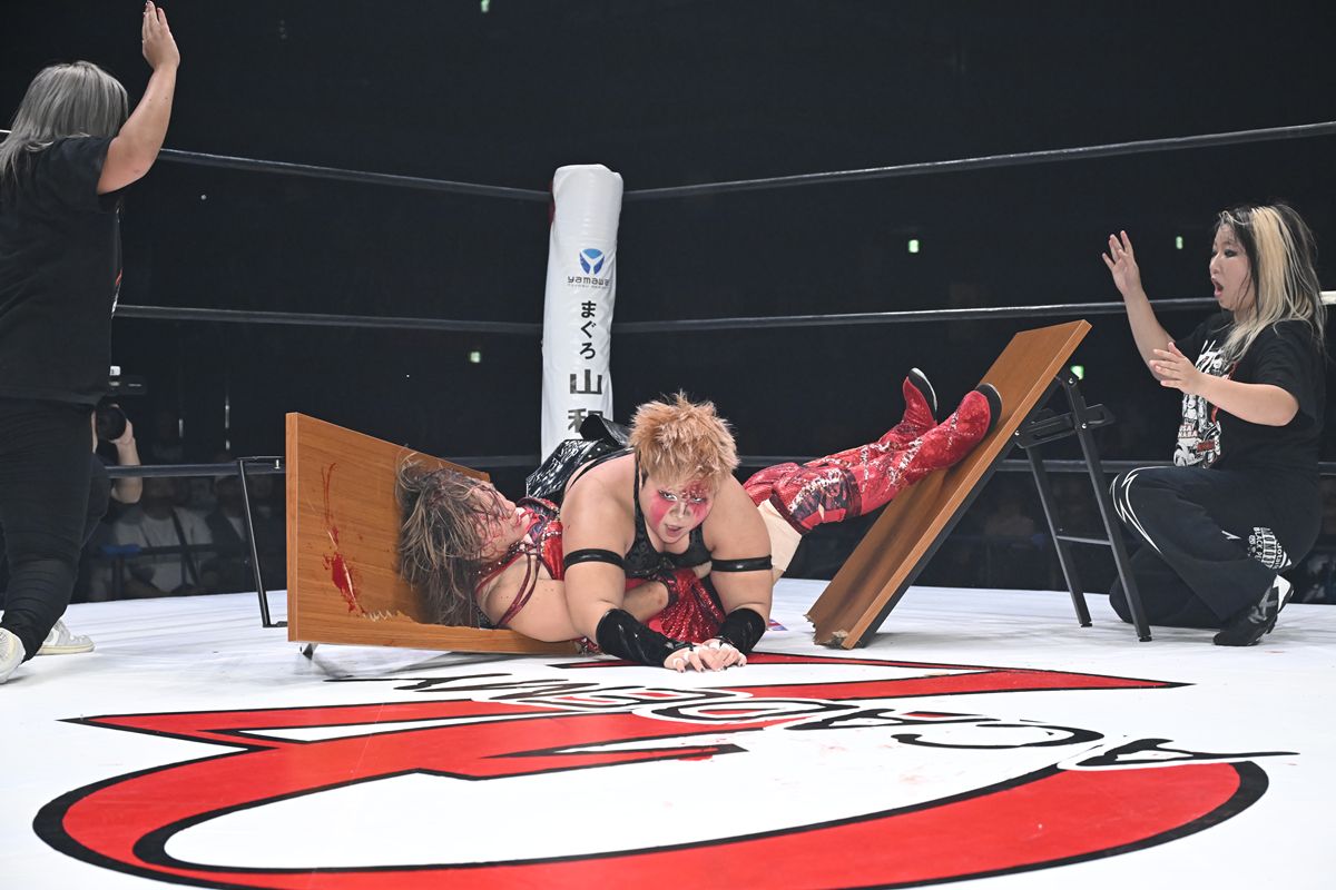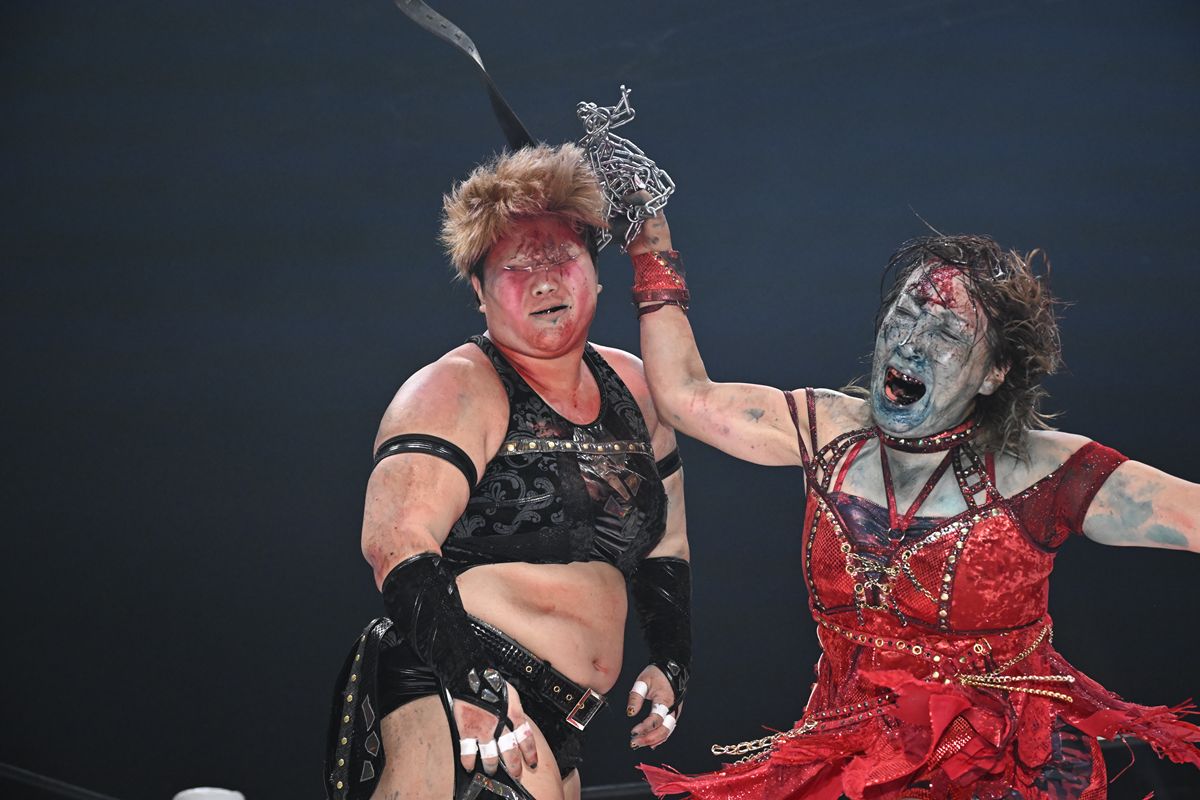 メインイベントで行われた「正危軍 vs H.A.T.E.全面戦争」は、47分を超える壮絶な死闘の末、正危軍を率いる尾崎魔弓がH.A.T.E.のリーダー、刀羅ナツコから勝利。
