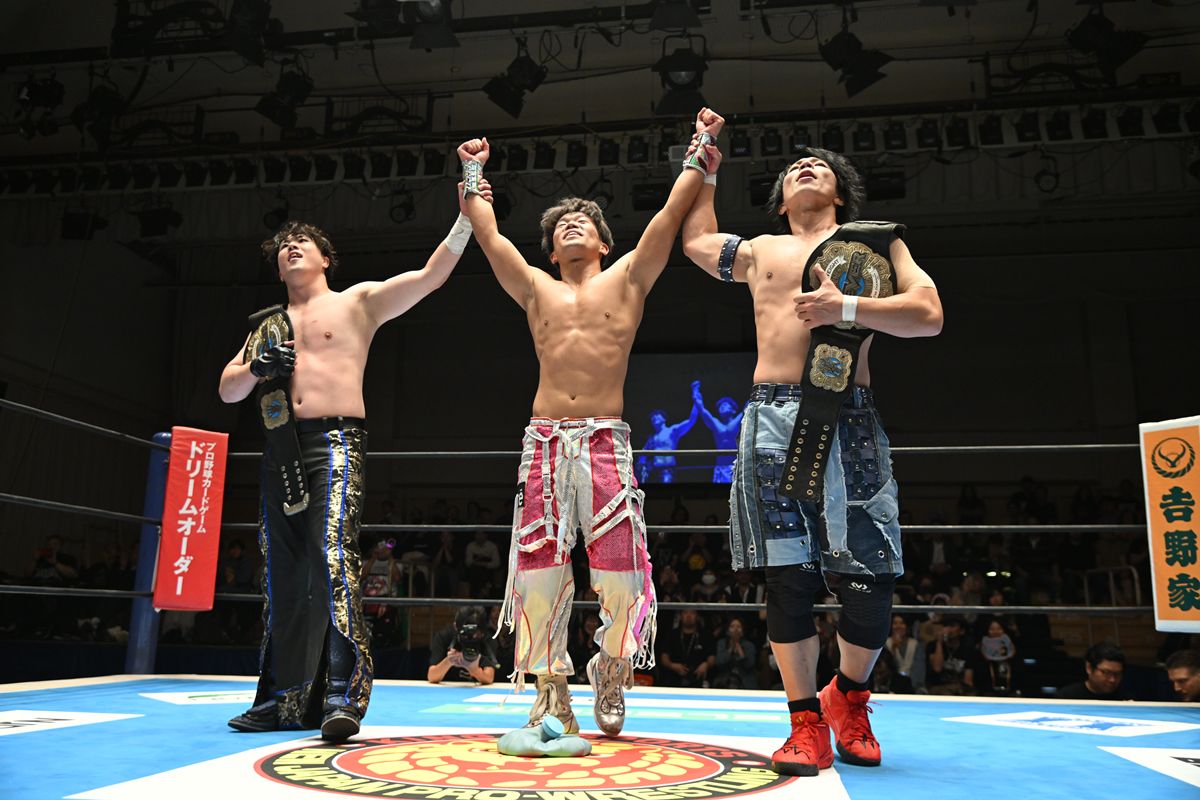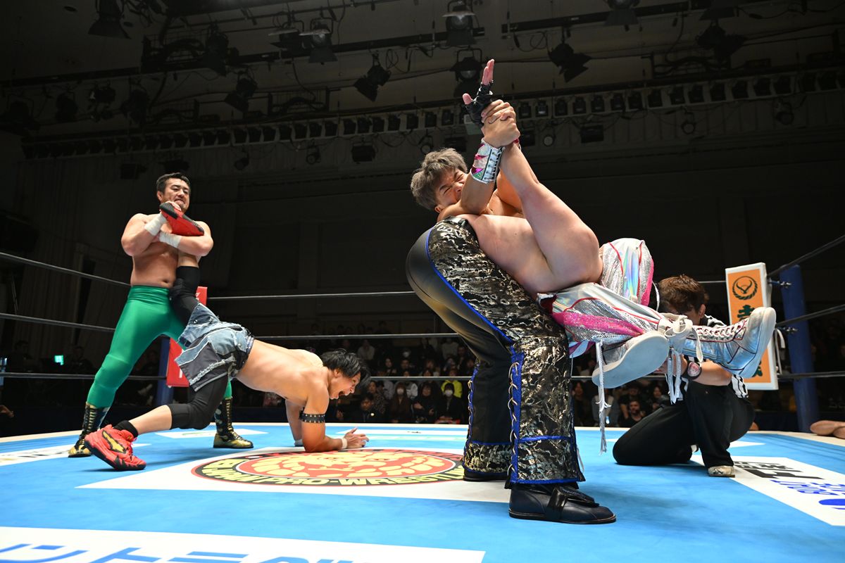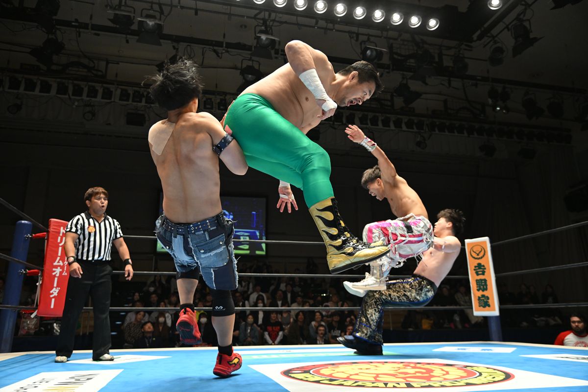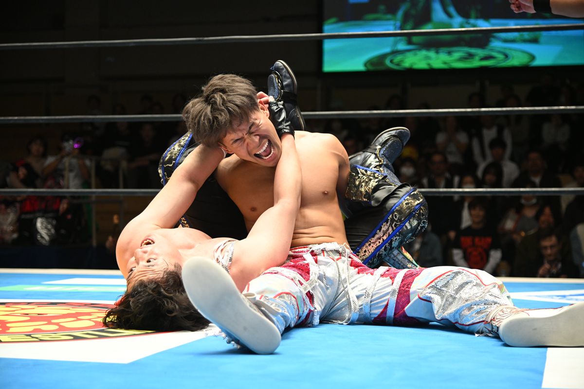 Bブロック公式戦で、YOH&マスター・ワトの生え抜きコンビが、田口隆祐&ドラゴン・ダイヤ組を破り、優勝へ向け好発進を切った。