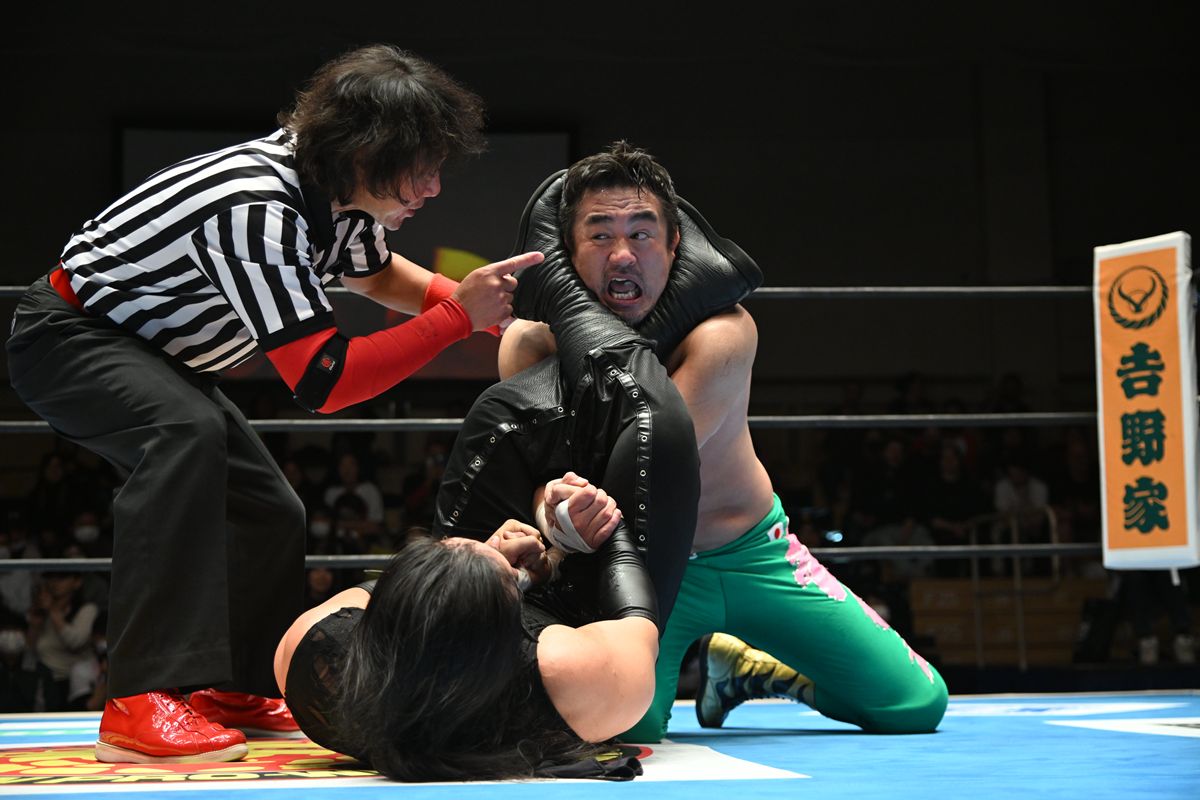 この一撃で意識が朦朧となった田口を、DOUKIが横入り式エビ固めで丸め込み、タイツを掴んでの非情な3カウントを奪取した。