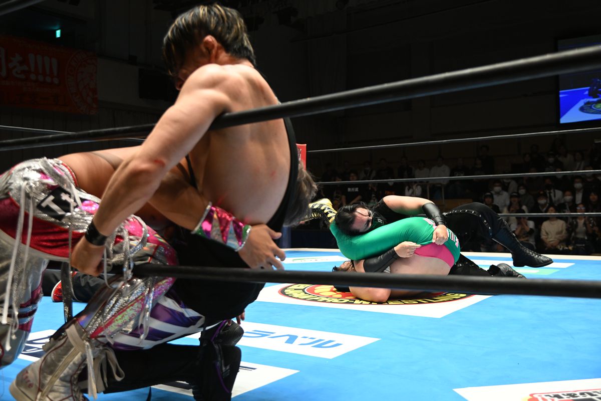 リングに戻っても、田口の尻にアトミックドロップを連発するなど、精神的にも肉体的にも徹底的に追い込んでいった。