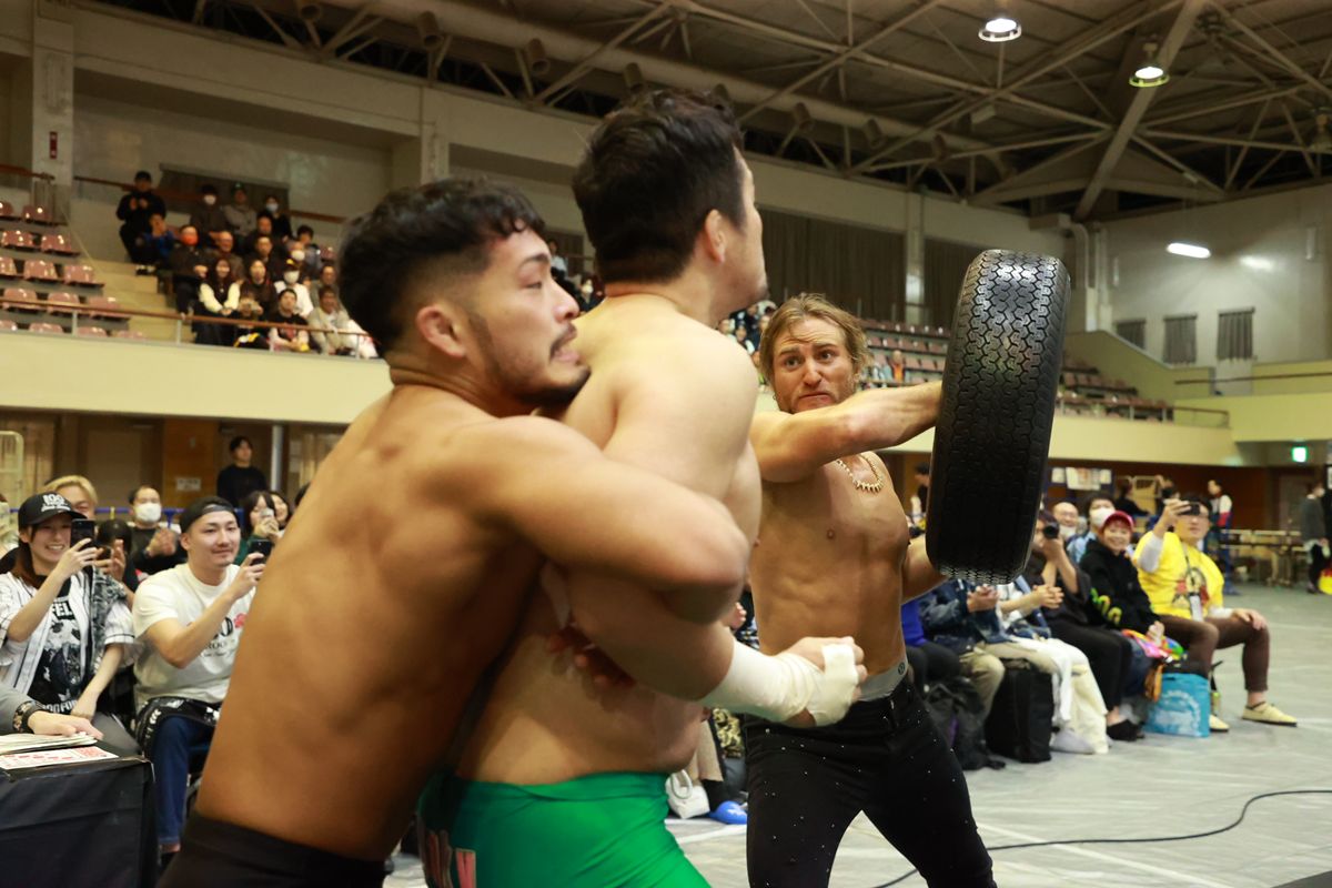 コナーズ&永井組は、“ホイールさん”と呼ばれるタイヤのホイールを凶器として持ち出し、田口の左肩を殴打するなど、“暴力”を前面に押し出した非情なファイトで試合のペースを握る。