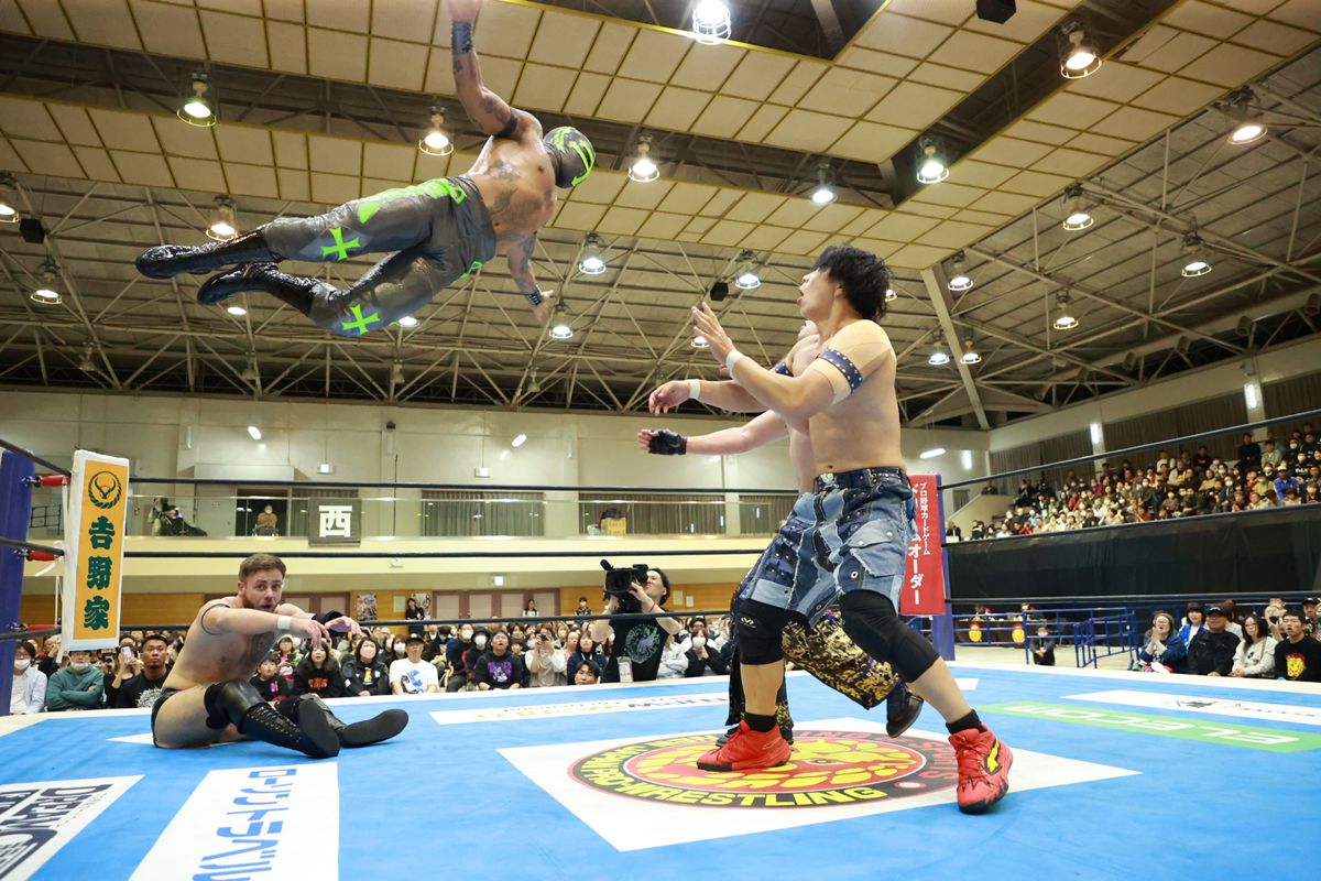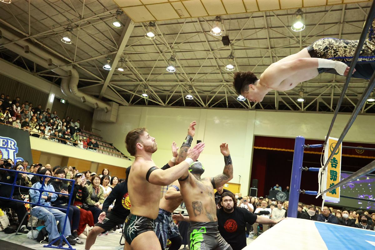 テンプラリオのスワンダイブプランチャがYOH&ワトを襲うなど、帝国コンビが勝利への執念を見せる。