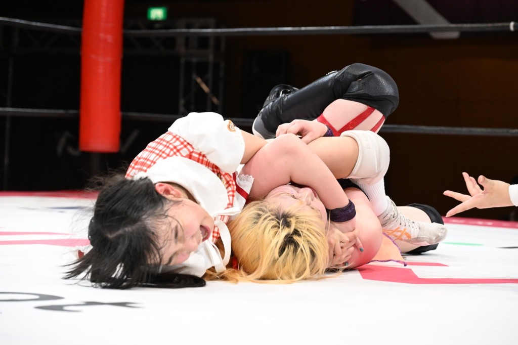 ドロップキック連発で攻め立てた高見は振り子式ドロップキック、コアラクラッチにいくも、脱出した七瀬はエルボー連打で3カウントを奪った。これで1敗同士となり再戦に持ち込まれた。