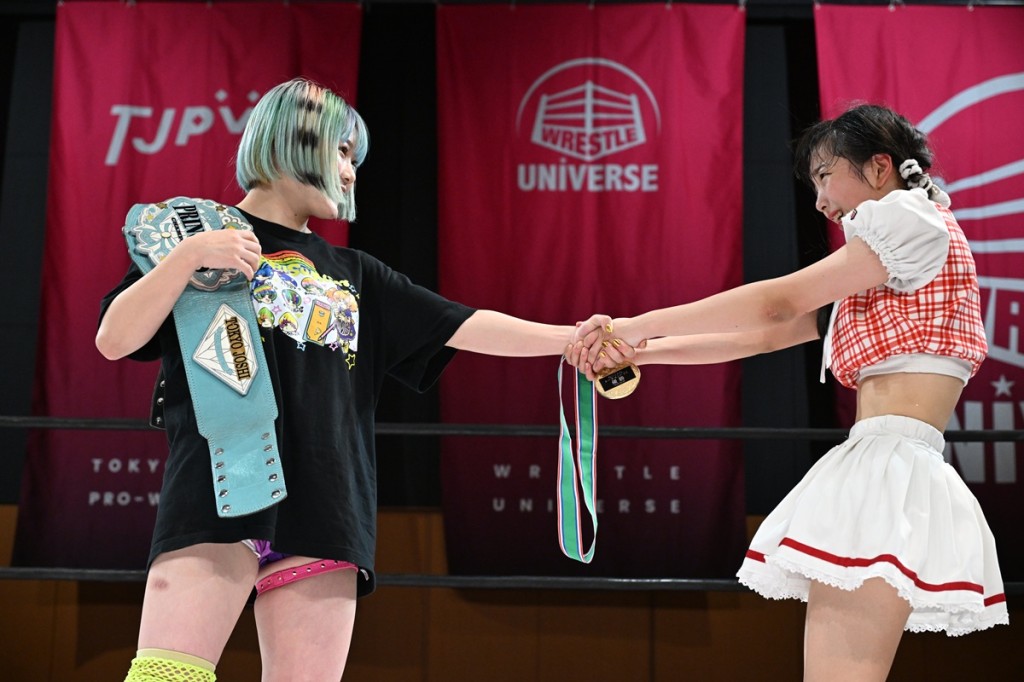 号泣状態の高見は遠藤を呼び出すと「有栖さんとシングルがしてみたくて、インターナショナルのチャンピオンなので、そのベルトに挑戦します!」とアピール。遠藤は「今の高見汐珠とシングルがしてみたい。11月の後楽園でベルトかけて戦おう」と快諾した。