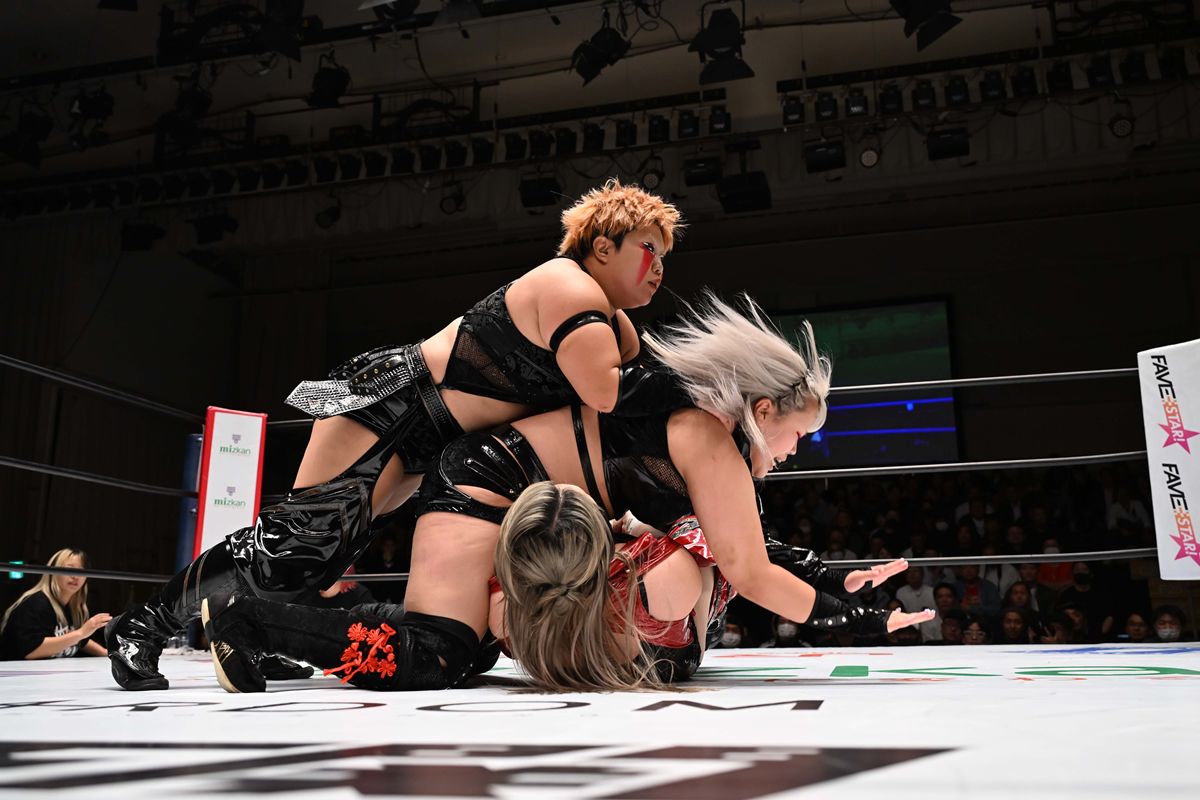 王者組の刀羅ナツコ&琉悪夏(H.A.T.E.)が、挑戦者組の山下りな&青木いつ希(ミ・ヴィダ・ロカ)を、H.A.T.E.総出の非情な介入の末に破り、2度目の防衛に成功した。