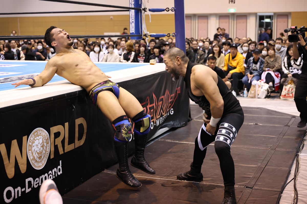 リング上、完全に孤立した東郷に対し、最後はKUSHIDAが必殺のテキサスクローバーを完璧に極め、東郷からギブアップを奪取。