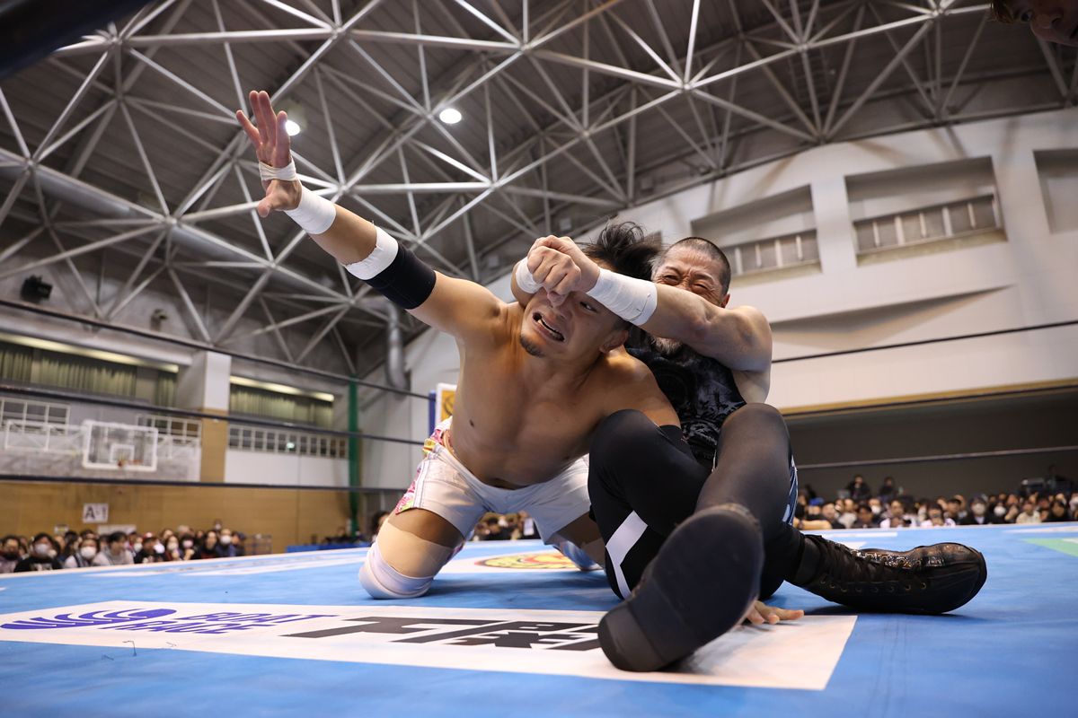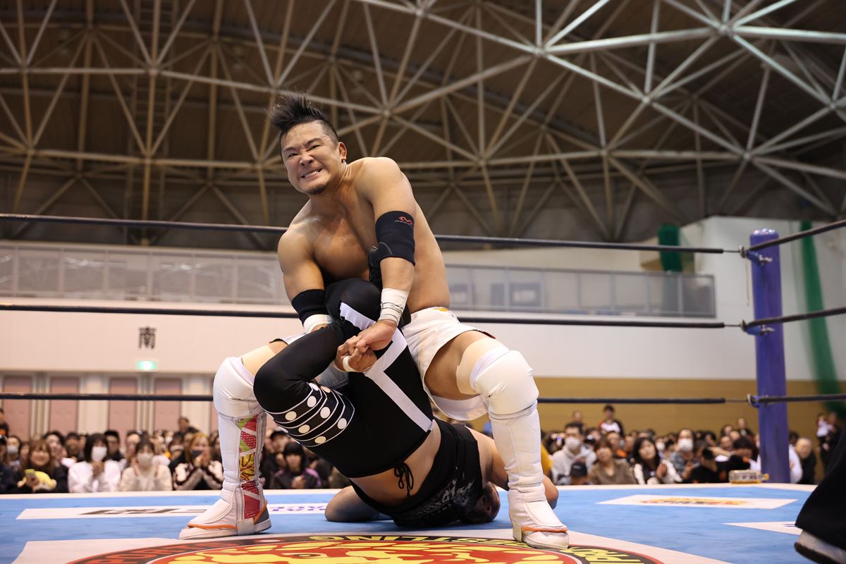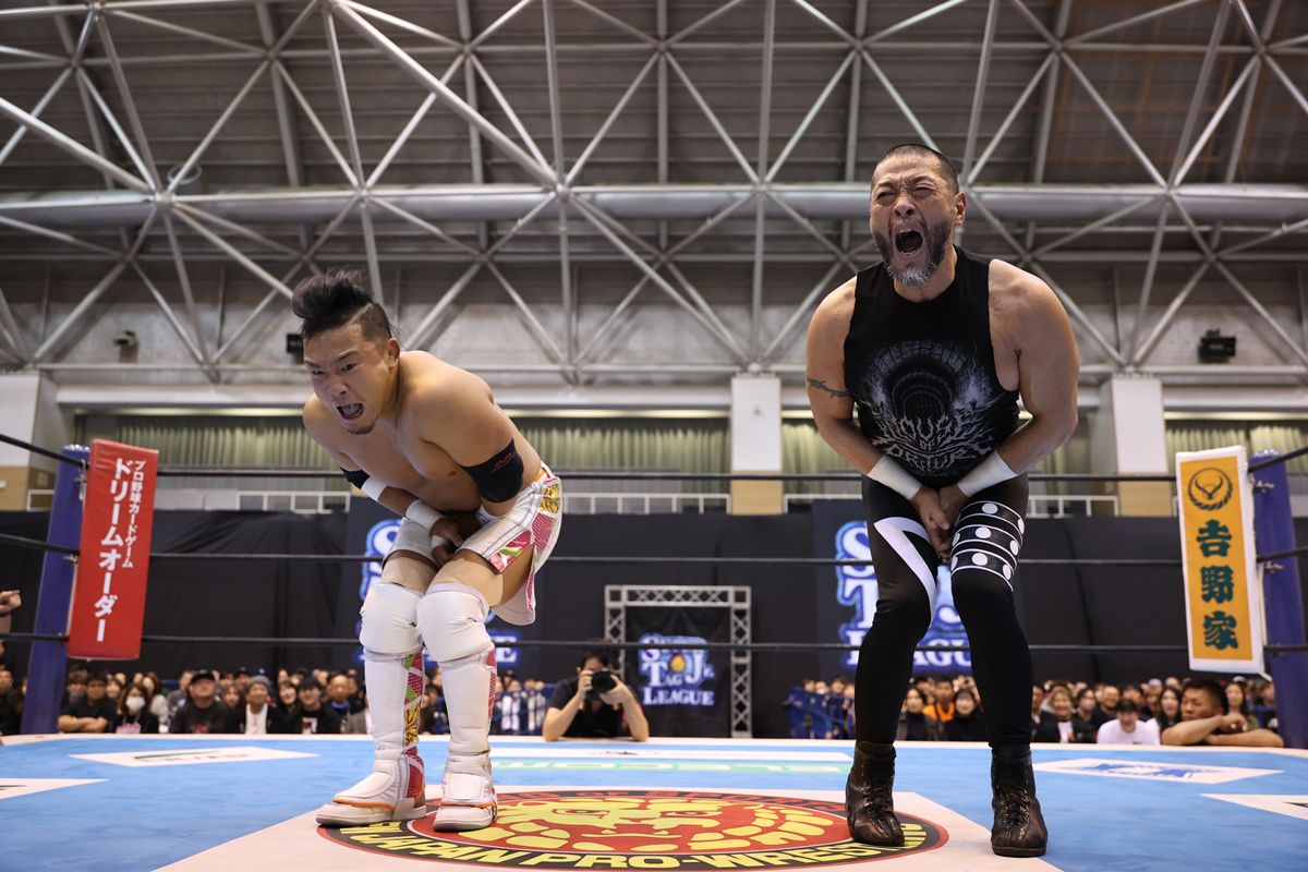 Bブロック公式戦の第4戦目、決勝トーナメント進出へ負けられないKUSHIDA&吉岡勇紀組(ドラゴンゲート)が、金丸義信&ディック東郷組と激突した。