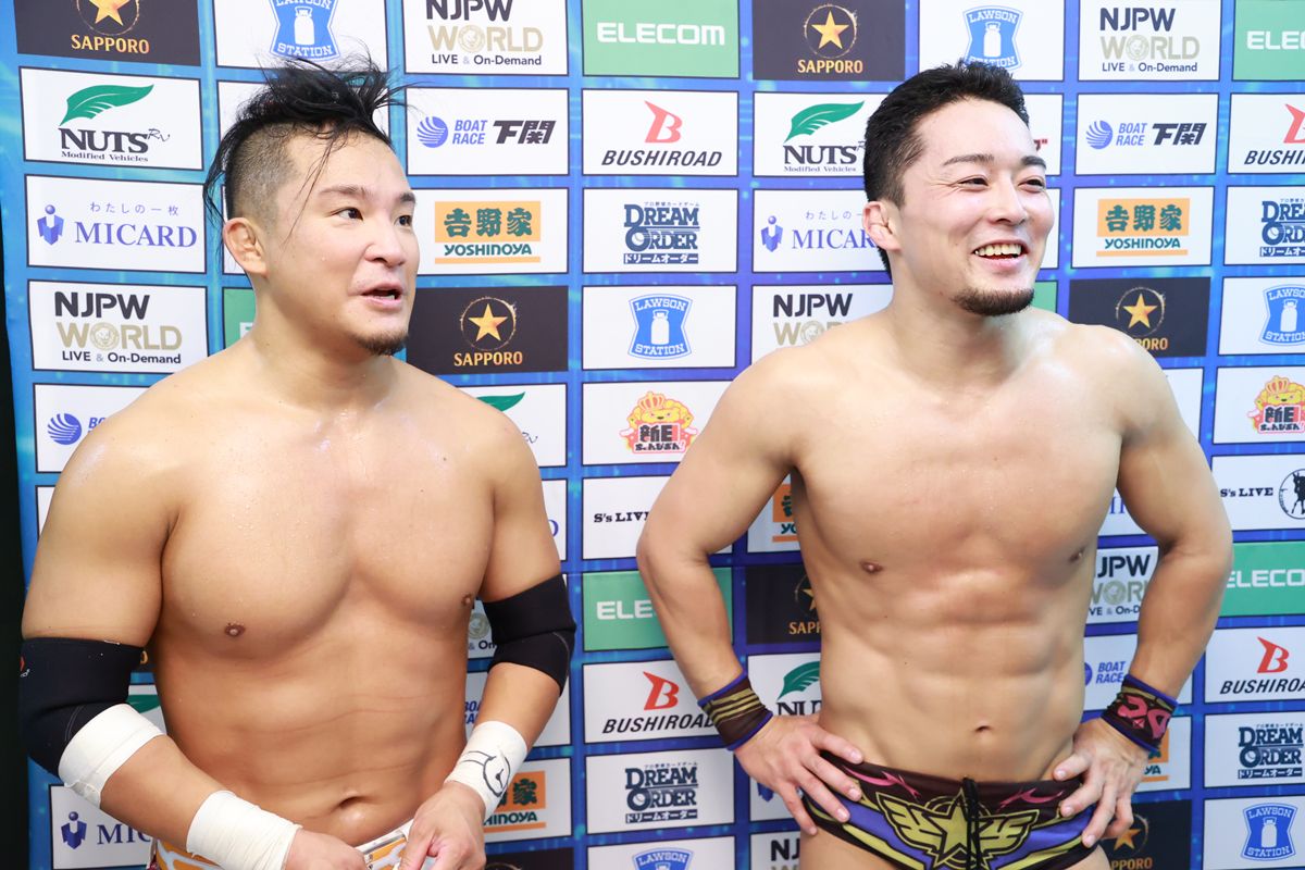 H.O.T.の老獪なインサイドワークを辛くも打ち破ったKUSHIDAと吉岡勇紀は、インタビュースペースの床に座り込み、激闘のダメージと安堵が入り混じった表情を見せた。
