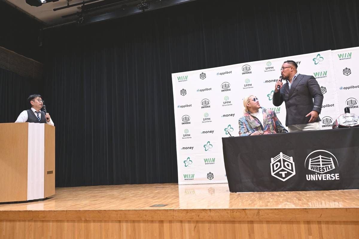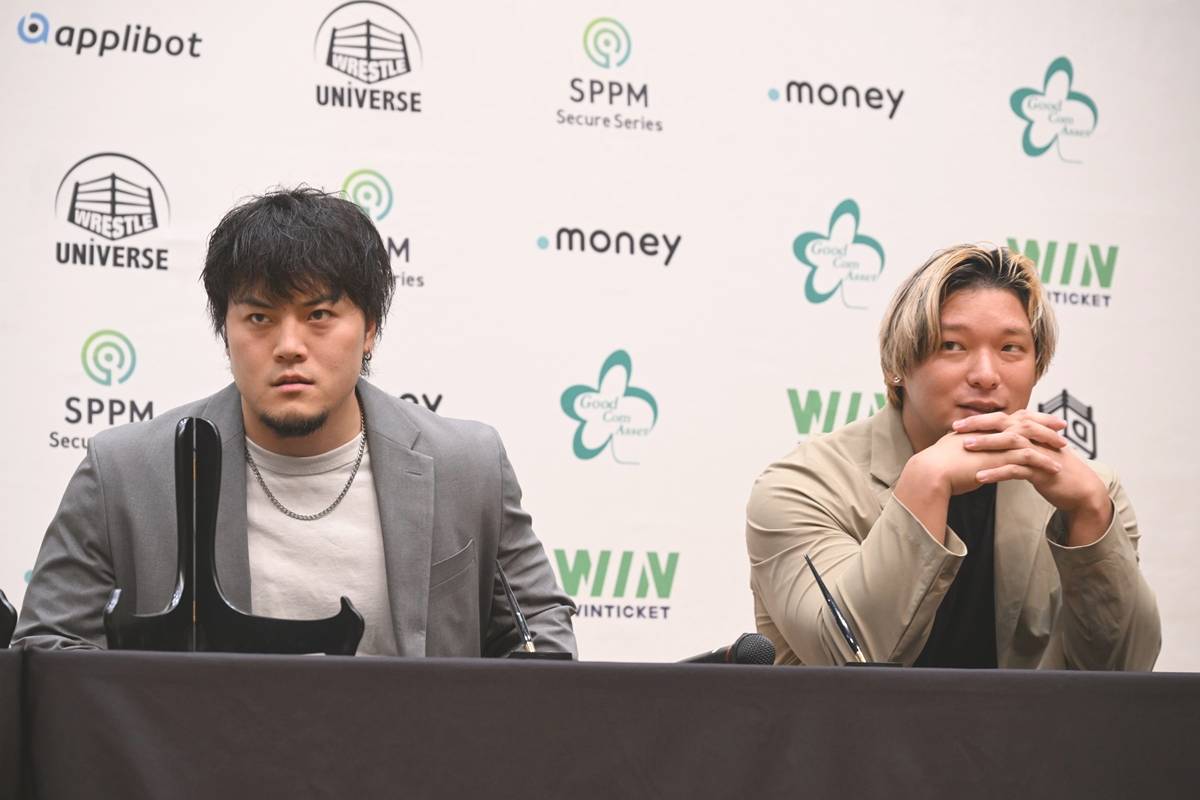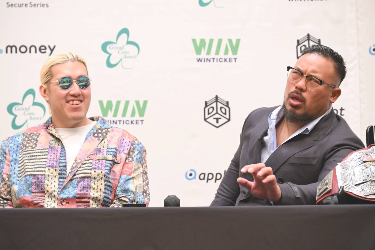 挑戦者組のKANONは「4月に結成して、この2人で組みましたけど、まだベルトを持ってないんで、ちゃんと結果を残して、S.L.C.の格をさらに上げたいと思います」とキッパリ。MAOは「S.L.C.やってきて、KANONはいろんなことを経験して。ダムネーションT.Aとか、前にいた団体とかでやってきて、成長してるとは思うんだけど。俺はキャリアのなかで、KO-Dタッグを何回も巻いてきたし、いろんなタイプの人と巻いてきて。今回初めてこういう大きい人と組んで。KO-Dタッグ、コイツらとやるから、100キロに増量して。ヘビー級転向じゃなく、この人たち対策なんで、仕上げてきました。この赤いベルトをKANONと巻いて、またこのベルト獲り戻して、DDT盛り上げようぜ。ドカンバコンのメンツで、リングがぶっ壊れるくらいの試合して、後の試合困らせてやろうぜ。俺たちが楽しめりゃいい。すげぇ祭りにしようぜ!」と意気込んだ。