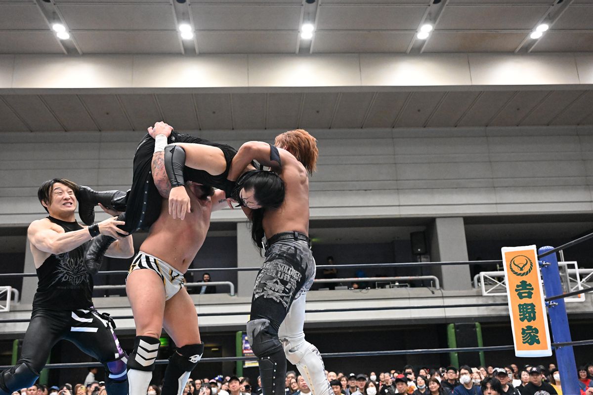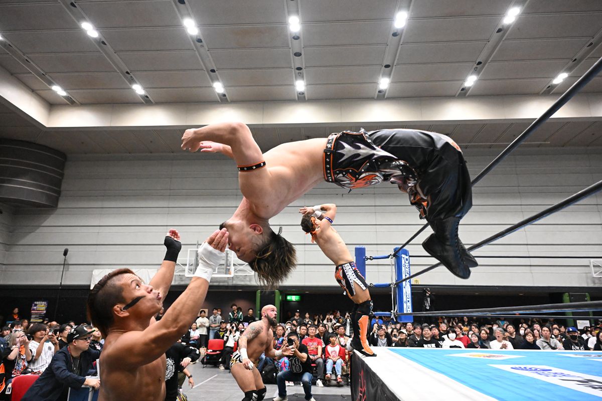 一進一退の攻防が続く中、ロビーが石森とエックス二人まとめてトペ・コンヒーロ(場外弾)を放てば、ロビー&藤田組がミサイルキックの合体攻撃を見舞う。対する石森&エックス組も、石森のスライディングジャーマンスープレックスからエックスがその場飛びシューティングスタープレスを繰り出すなど、両チーム一歩も引かない総力戦となった。