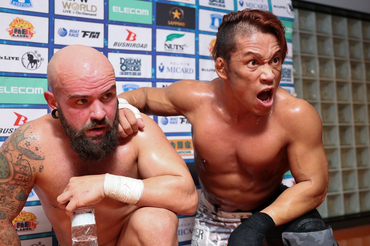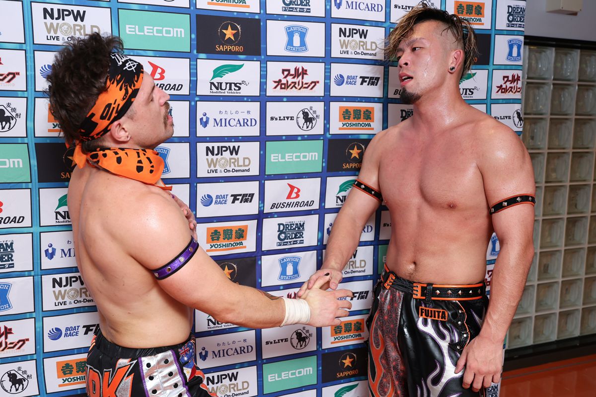 ロビー・イーグルス&藤田晃生 ロビーは「ワルイ、クソーッ! ミナサーン! ゴメンナサーイ!」と日本語で謝罪。藤田は「『俺たちに勝ったんだから、お前たちが優勝しろ』。俺はそんなこと言えない」「このタッグリーグに懸けてきた思いが今日砕かれて、そんな1分、2分前のことすぐに切り替えれると思わねぇ」と、無念の敗退に悔しさを滲ませた。ロビーは石森を「俺の“クリプトナイト”かもしれない」と評し、1対1でのリベンジを誓った。