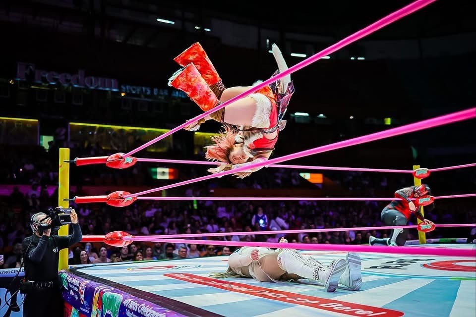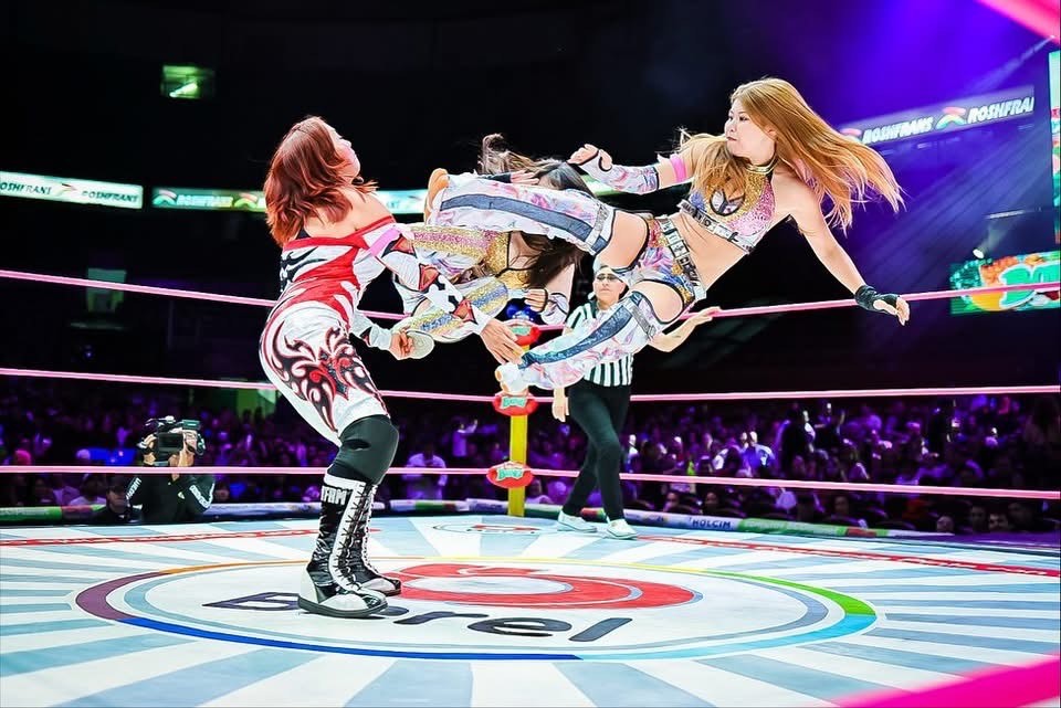 まずはFWCがダブルのドロップキックでマルセラから先制する。すかさず、葉月はマルセラを捕らえてロープに磔攻撃。今度はスヘイを捕えるとコグマのキャメルクラッチに葉月が低空ドロップキックを放つ。コグマはスヘイのこめかみをグリグリと当てると、クマポーズ。メキシコに来て初めてクマポーズを決めた。