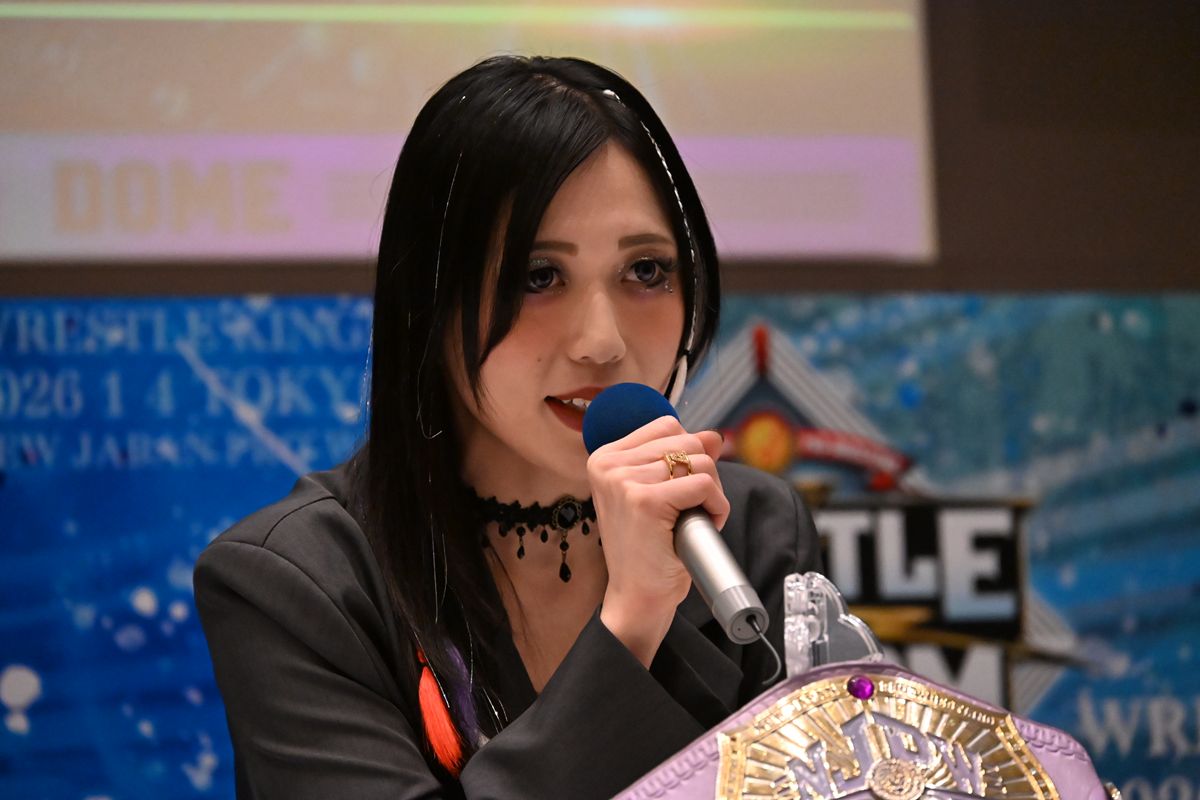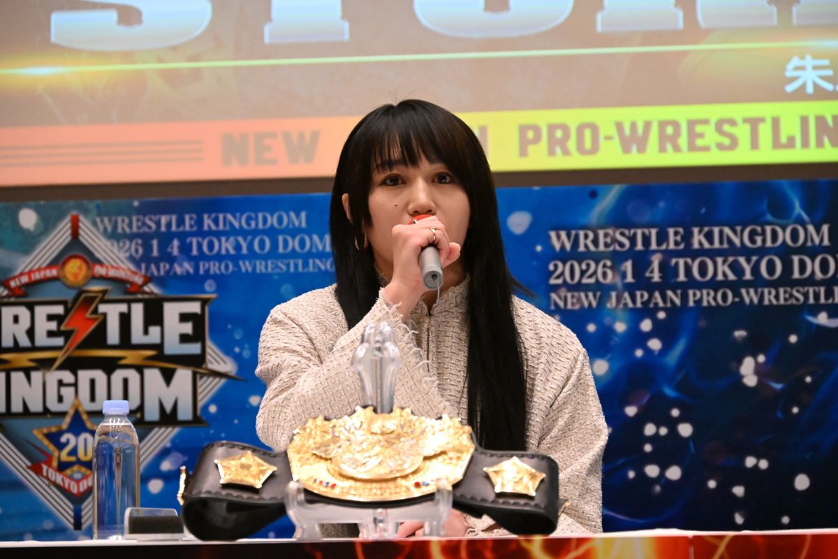 「IWGP女子、そしてSTRONG女子。二つのタイトルマッチがこの大舞台で行われることを誇りに思います。女子プロレスの“強さ”と“おもしろさ”を、世界に見せるチャンスだと思っています。上谷と最高の試合を見せたうえで、最後は私が勝利します。チャンピオンロードはまだ始まったばかり。絶対に負けません」