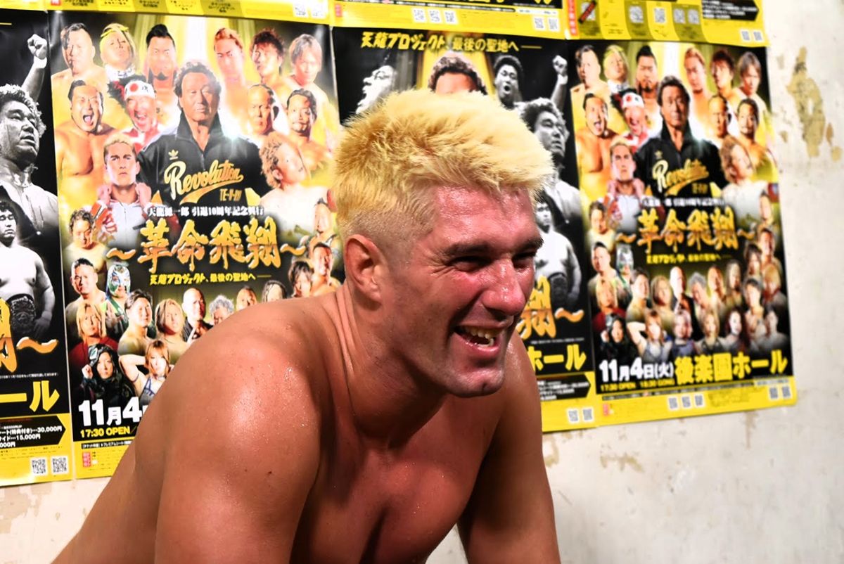 キノウハDDT、キョウハ天龍プロジェクト、ライシュウハDRADITION。俺は二度のIWGP世界ヘビー級王者かもしれないが、俺のスピリットはいろいろなところを巡る、インディーレスリング団体に根ざしている。日本の残りの地域を制覇してから、またIWGP世界ヘビー級を狙うよ。ありがとう」