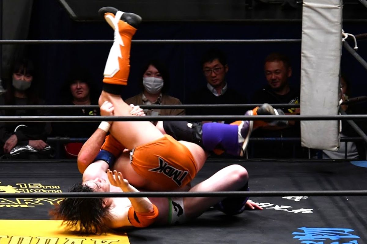 コブラツイスト、ローリングクレイドル、そして丸め込み合戦と、目まぐるしく攻守が入れ替わる展開となったが、最後は一瞬の攻防であった。
