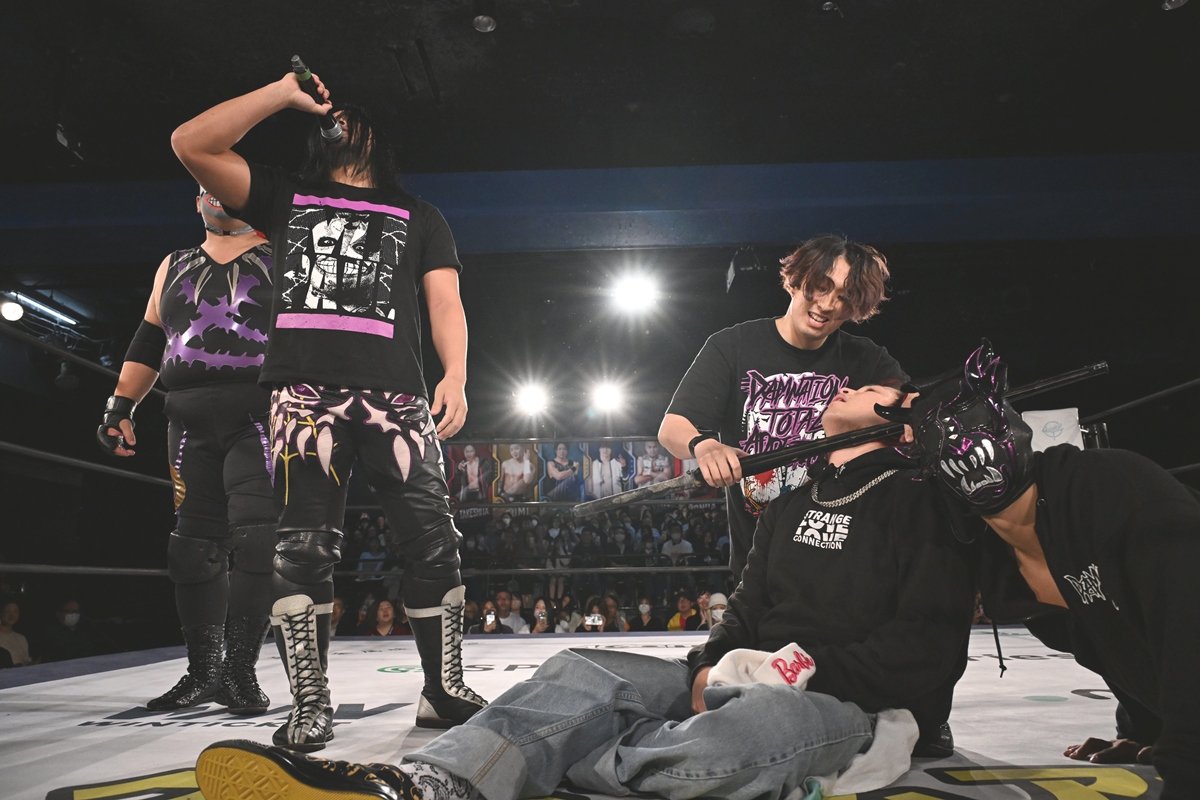 これを見逃すダムネーションT.Aではなかった。岡谷が竹刀で素人のKIMIHIROをぶっ叩くと、佐々木とイルシオンも暴行をはたらく暴挙。佐々木が「てめえのラップなんて誰も聞きたくねぇんだよ。てめえのしょうもない仲間たちに伝えておけ。リングに上がれねぇから、ベルトはとっとと返上しろってな」と言えば、岡谷は「ここがプロレスのリングってことを忘れんな。全員潰してやる。MAO、KANON、今日のところは休んどけ。お休み!」と吐き捨てると、MJポーも加わって4人で蹴飛ばした。