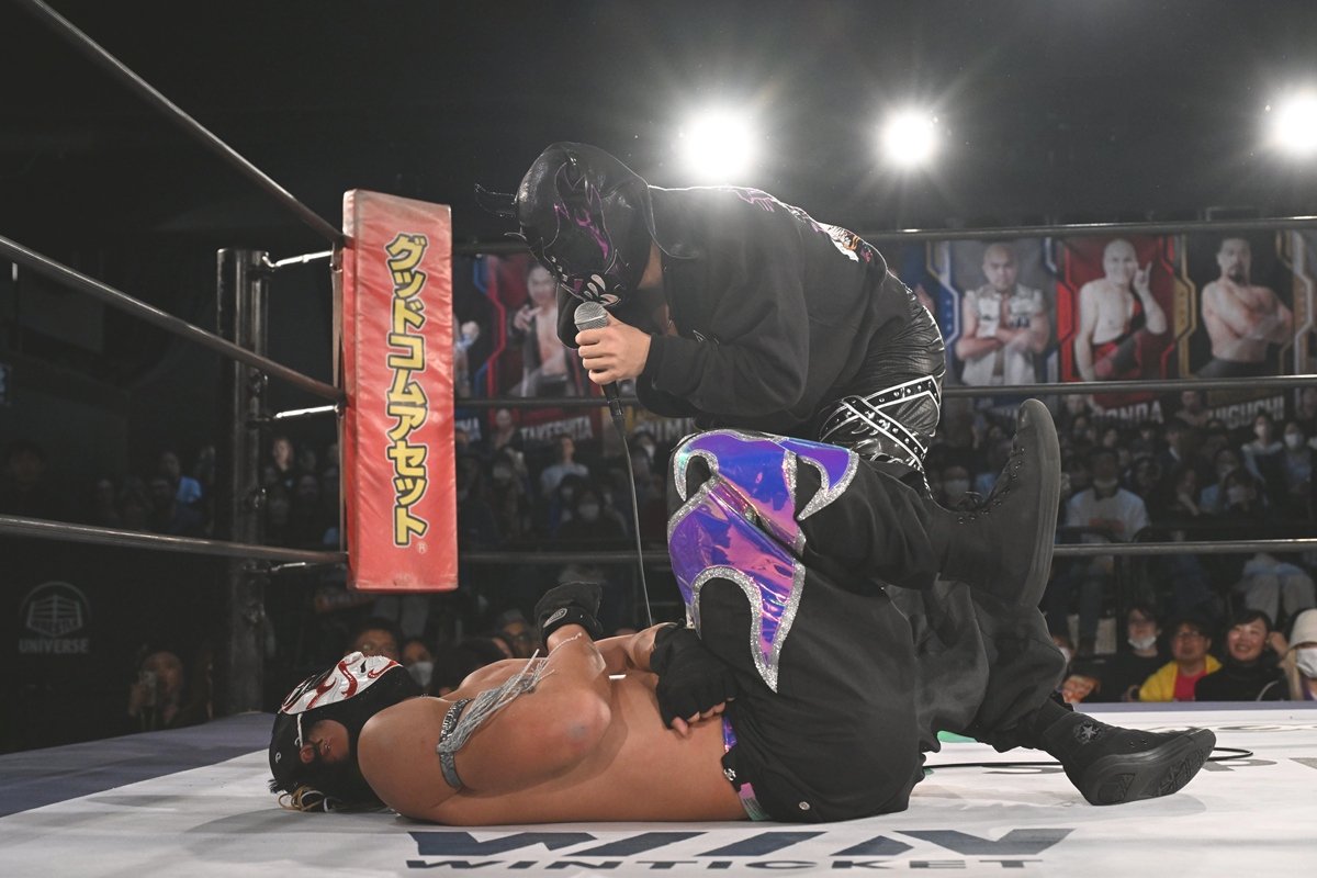 DDTプロレスが11月6日、東京・新宿FACEで「両国アフター ~It’s a wonderful battle~」を開催した。ダムネーションT.Aの佐々木大輔と岡谷英樹が今大会を体調不良のため、欠場したストレンジ・ラブ・コネクション(S.L.C.)のMAO&KANONからKO-Dタッグ王座強奪を宣言した。