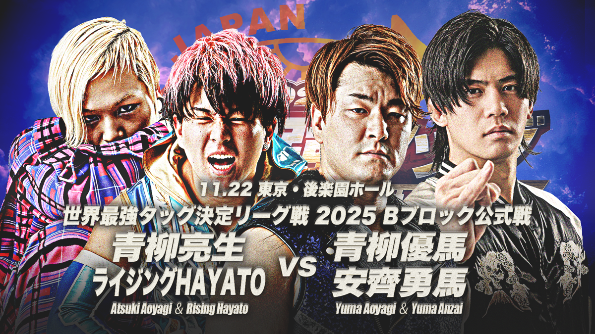 Bブロックの最大の注目は、青柳優馬&安齊勇馬組 vs 青柳亮生&ライジングHAYATO組の一戦。
