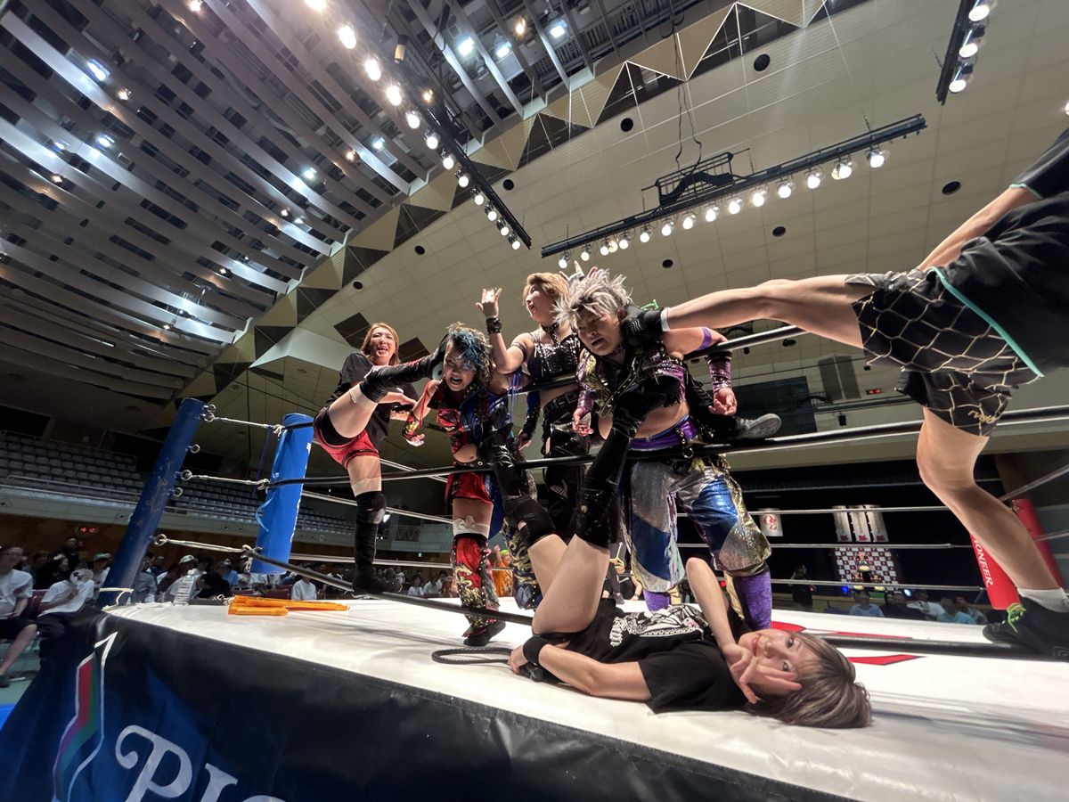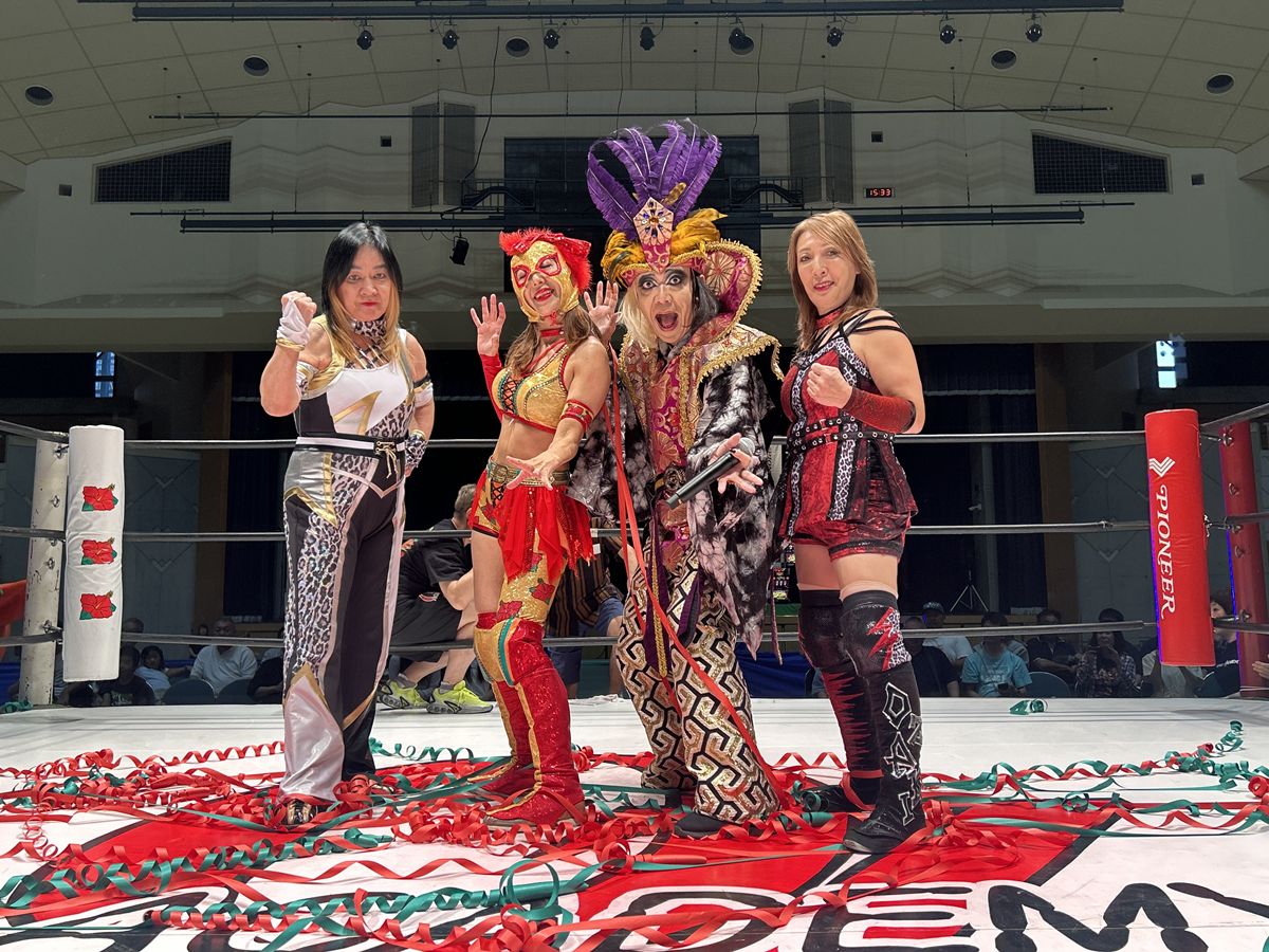 セミファイナルでは、ジャガー横田&尾崎魔弓&マスクド・ハナハナ組が6人タッグで勝利。
