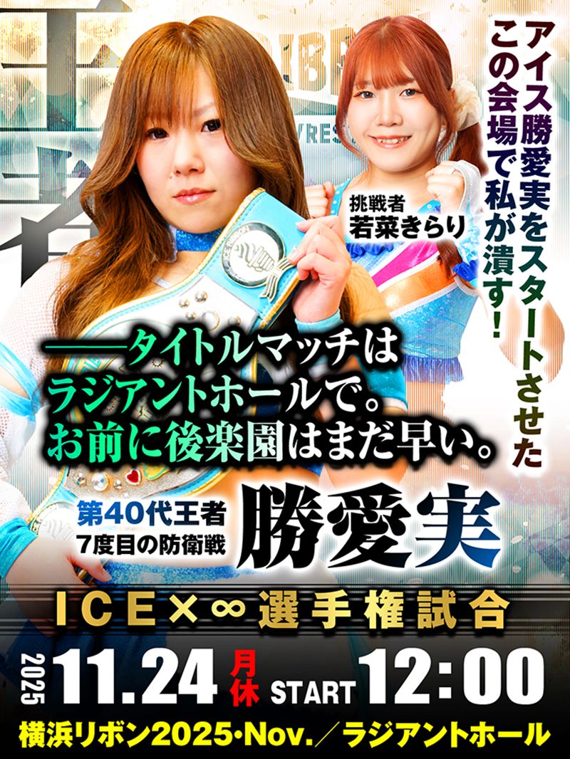 メインイベントで、ICEx∞選手権試合、王者・勝愛実 対 挑戦者・若菜きらりのタイトルマッチが決定した。