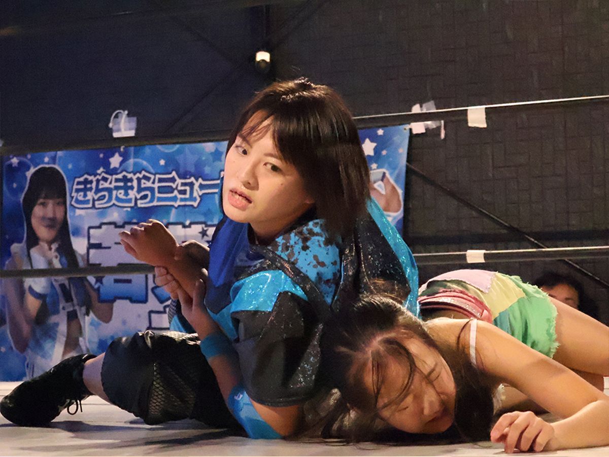 ニュートラルコーナーのエプロンに立ったきらりが「早くほめてください!」と地団太を踏む中、きらりのコスチュームを着せられた2人はバックの取り合いからグランドの攻防と、きらりの存在を無視して試合に集中。杏ちゃむが海乃をコーナーに振って飛び込むも、これをかわした海乃が初めてきらりを「かわいい!」とほめ、喜んでリングインしたきらりと2人で杏ちゃむを対角コーナーに振ると、海乃がきらりを振って、きらりが串刺しドロップキック、続けて海乃が串刺しエルボーを決めカバーもカウント2。