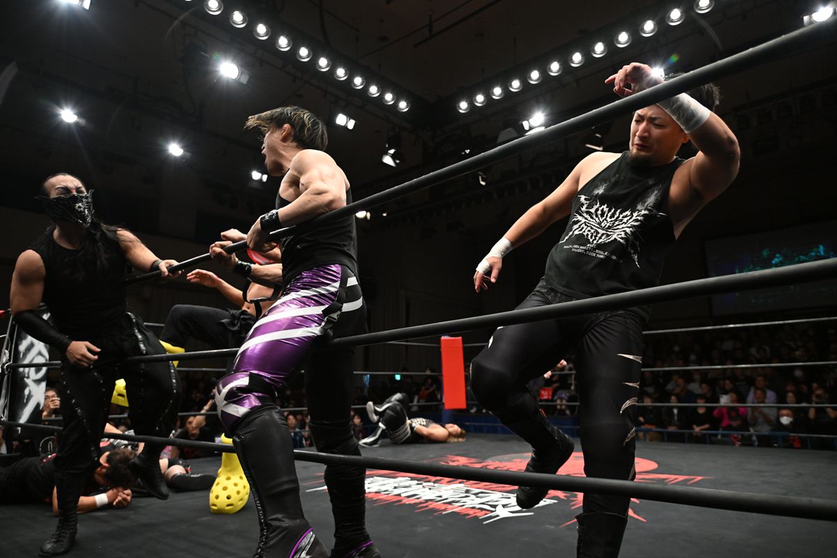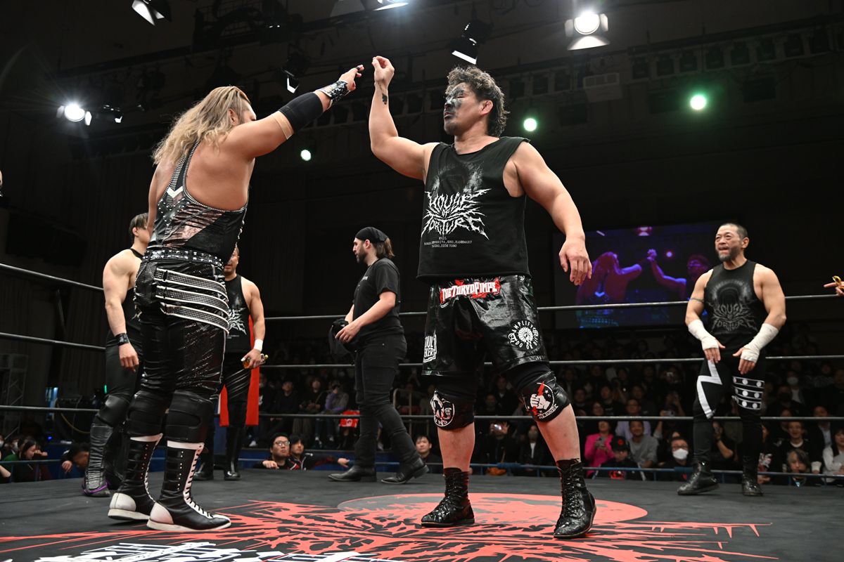 EVILサイドには東郷、SANADA、成田、ファレが立ち、裕二郎サイドにはオーエンズ、金丸、DOUKI、SHOが陣取り、完全に二手に分かれて睨み合う形となった。