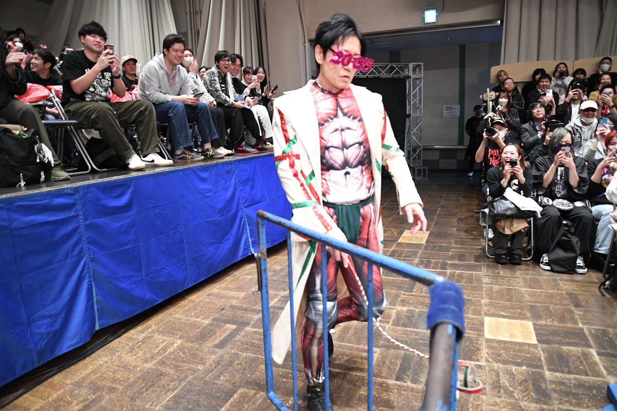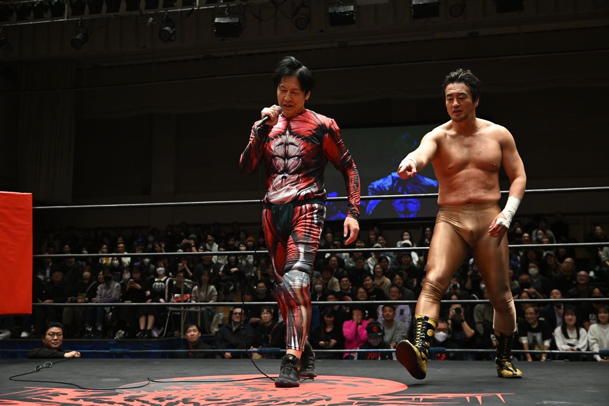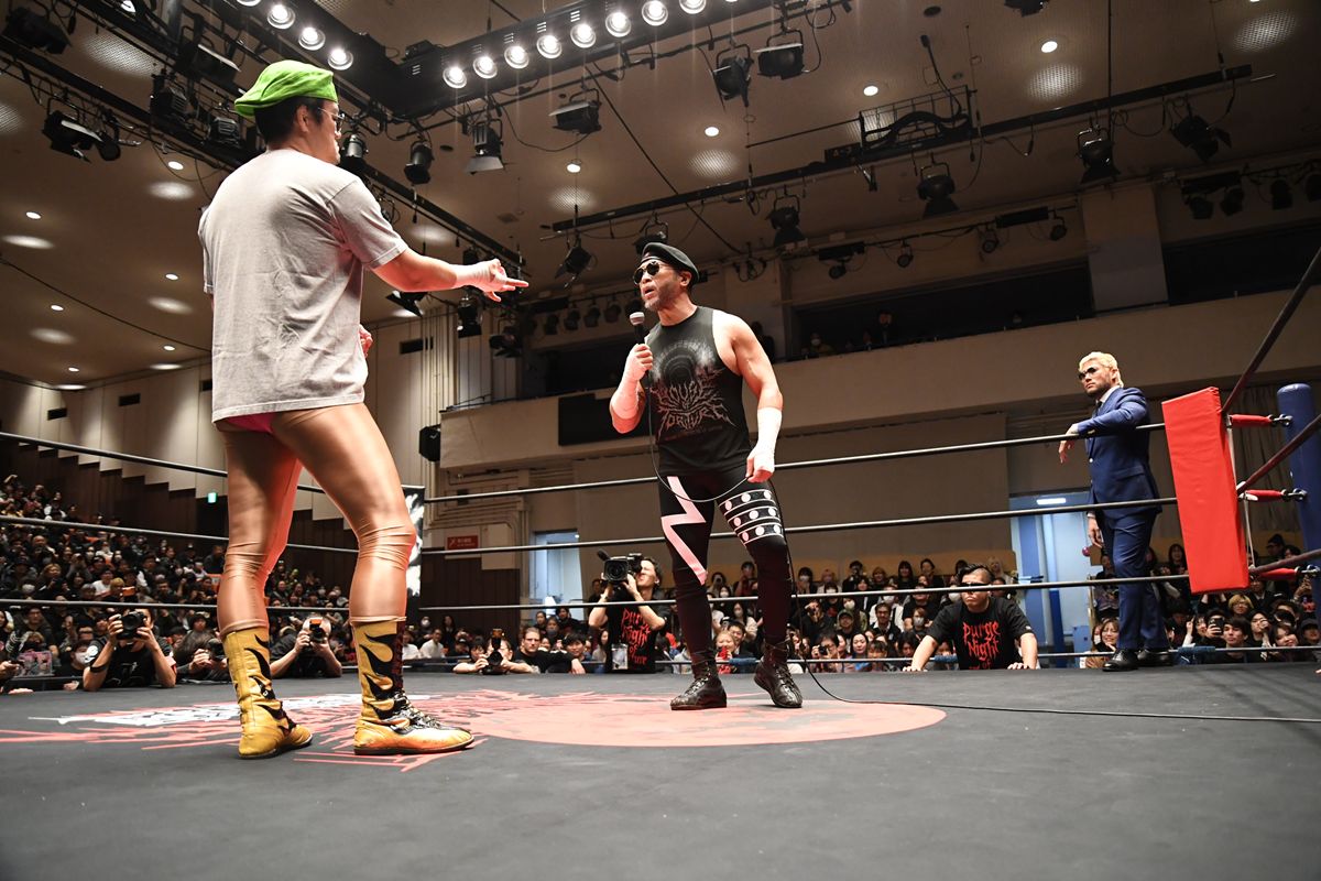 試合前、サングラスにスーツ姿の“サナダ・コレクションSS”ことSANADAを従えて入場したディック東郷は、豆を食べながら登場したヒップ東郷に対し、マイクで説教を開始。