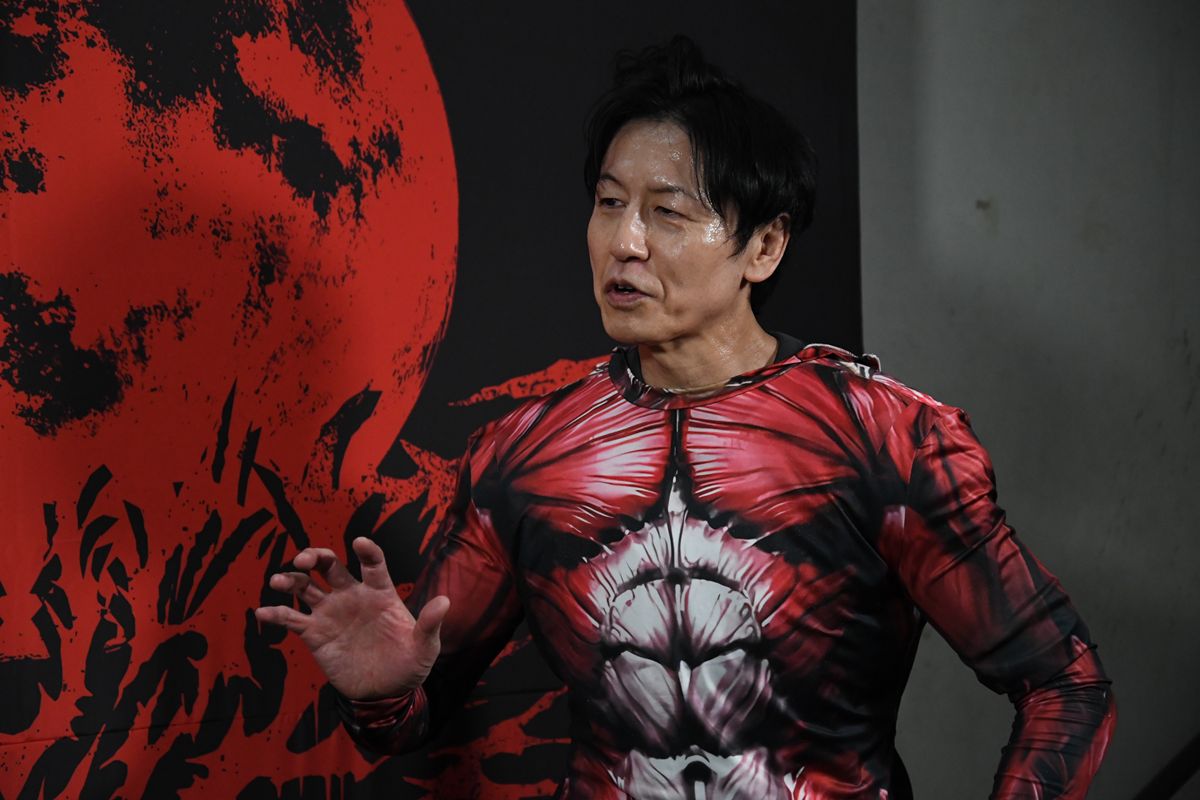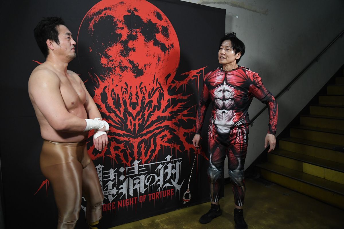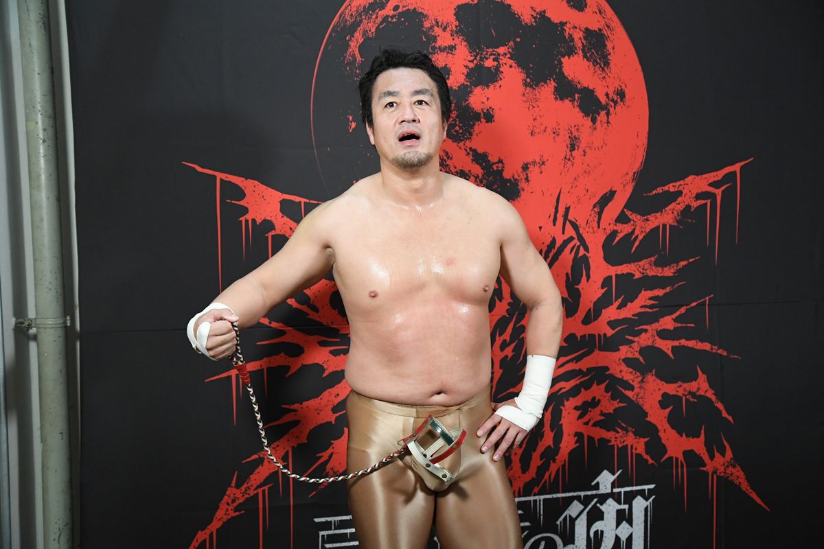 さらにサナダはスーツを脱ぎ捨てマッスルボディスーツ姿になると、ミケーレをリングに連れ込み首輪を追いかけるという暴挙に出る。