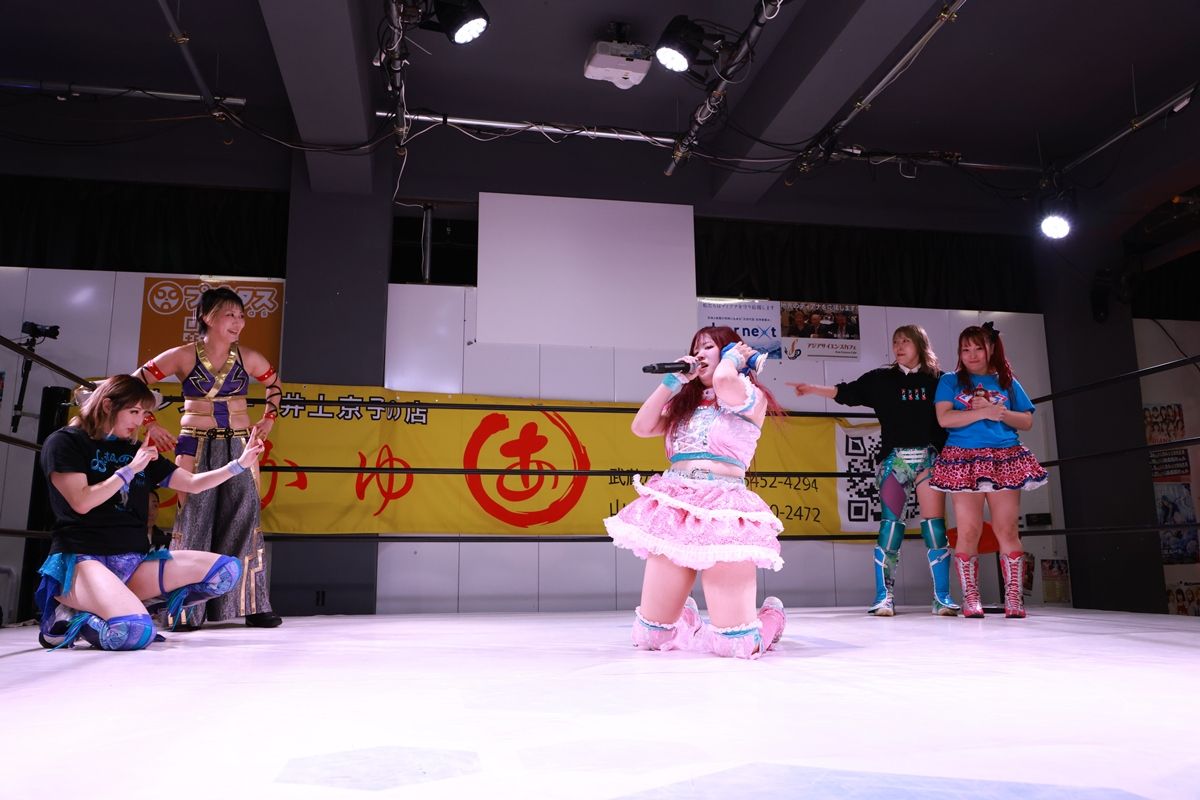 ここで愛梨紗が「お客さんが“えー!”って言ってたじゃないですか。飛鳥プロレスに紫雷美央は必要ってことですよね。ということは紫雷美央と対戦したい人もいるんじゃないですかね?」と言い出すと、神姫楽ミサが登場。ミサは「おまえ、この間、負けてんだよ。やり返すから!」と対戦要求すると、美央が「ミサ単体より、1111(フォーワン)のほうが好きやねん」と言うと、柳川澄樺がリングイン。