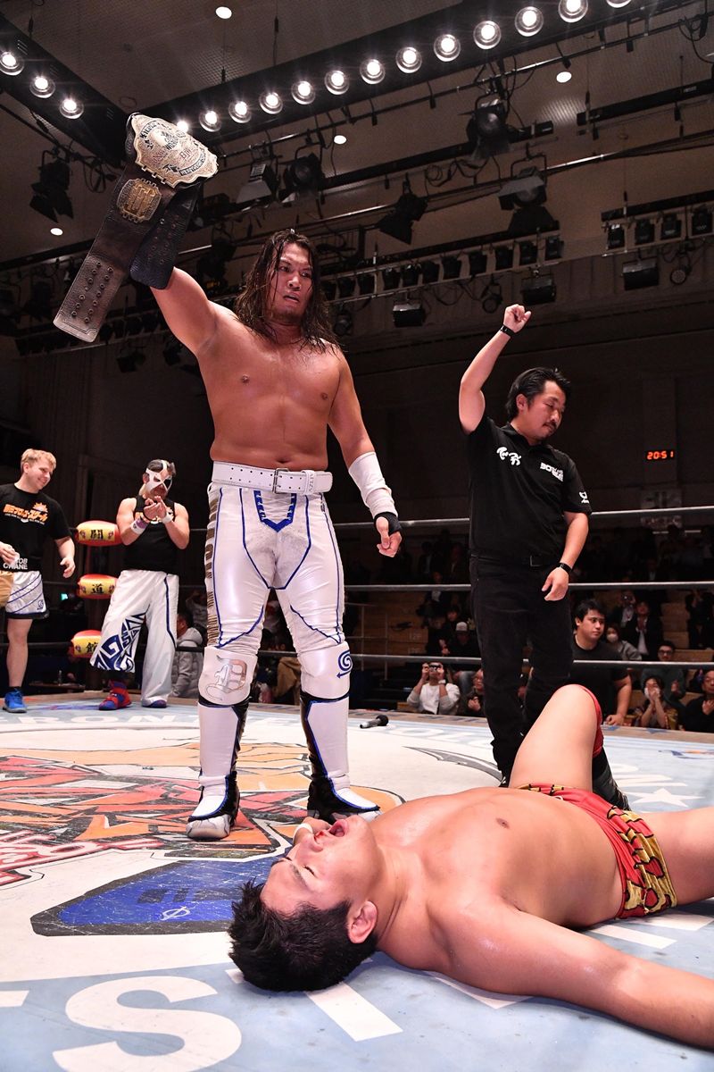 試合は熱戦となったが、ペースを握った大門寺は最後、必殺のブラックレインで青木をマットに沈めた。
